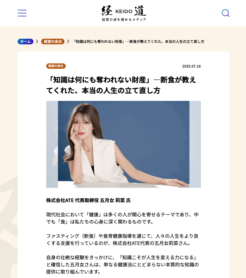 経営の道を極めるメディア”経道”にて掲載されました!その他 / By RINA 経営の道を極めるメディア”経道”にてインタビューが掲載されました。 経営理念から、経営に至るまでの背景、弊社の運営について、私の想いや哲学など多岐に渡って語っています!よろしければ下記からご覧ください。 「知識は何にも奪われない財産」—断食が教えてくれた、本当の人生の立て直し方