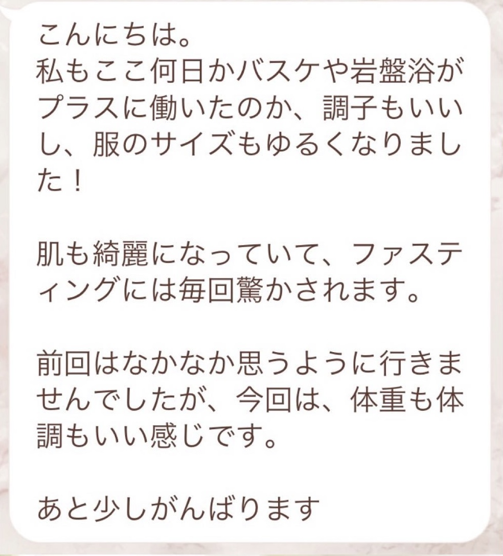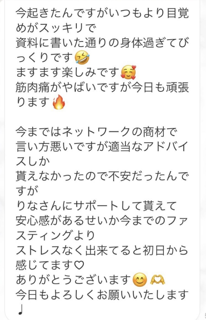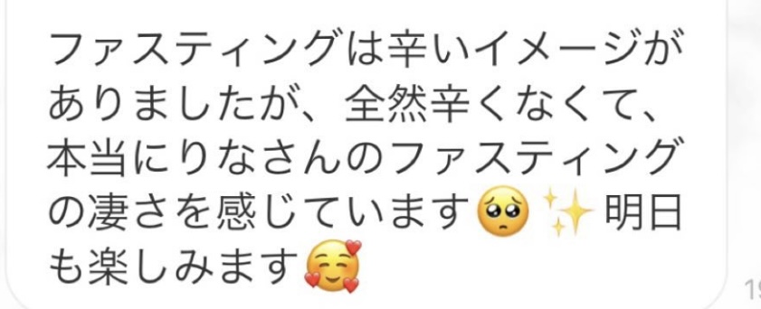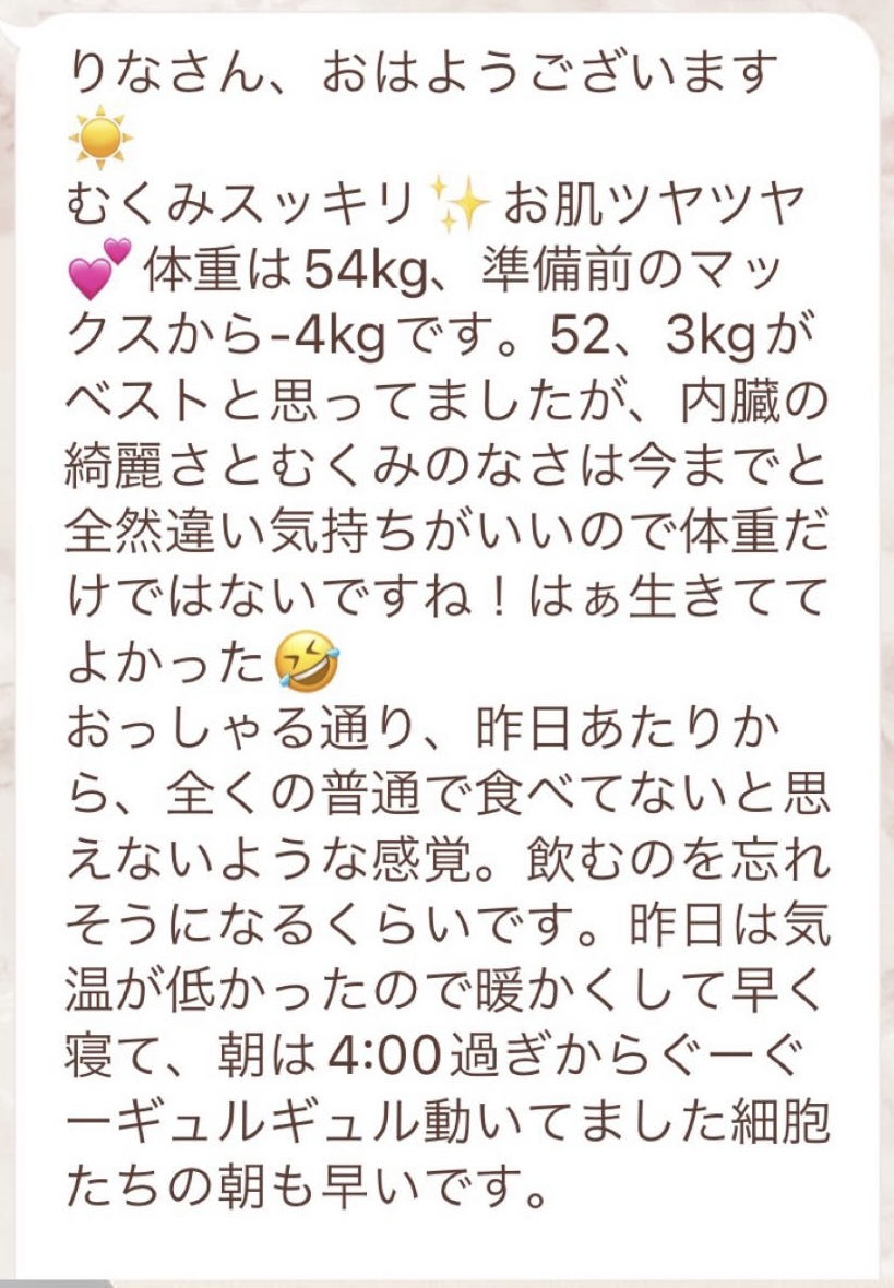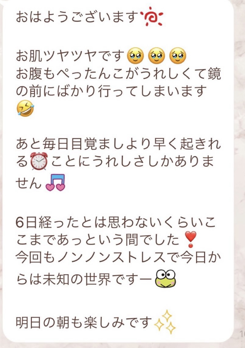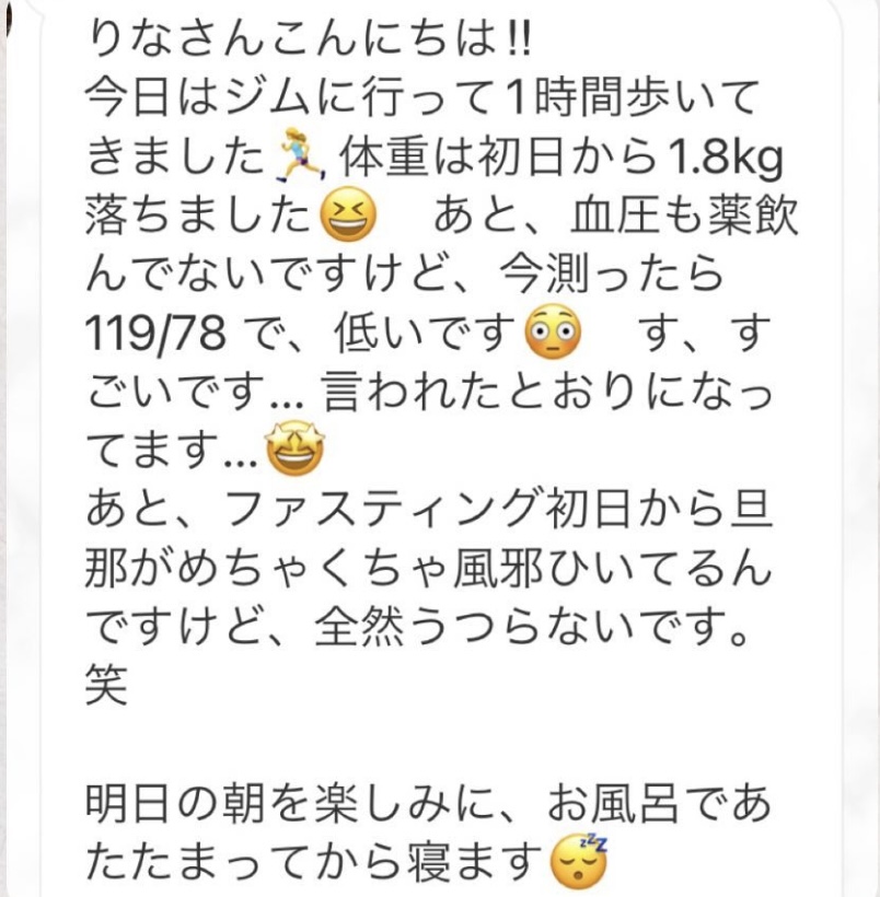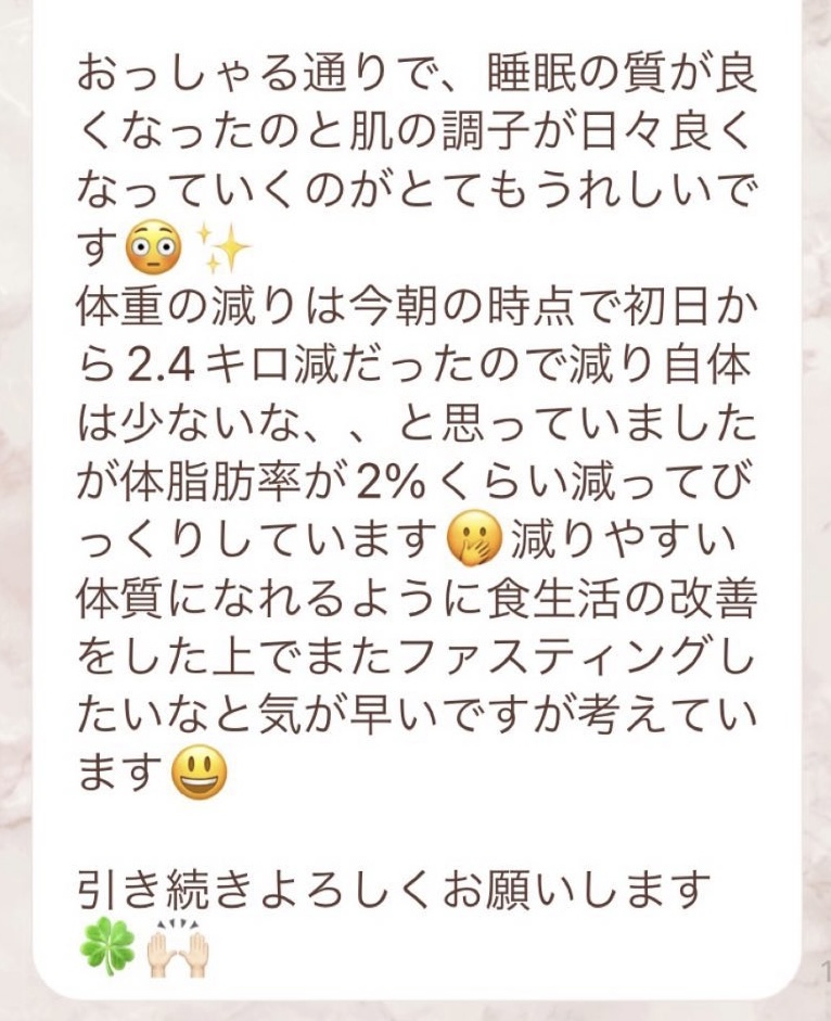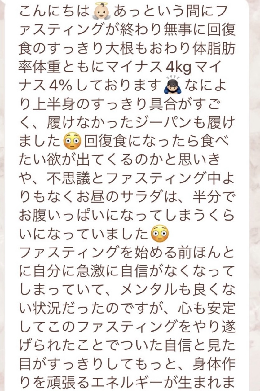 5日間の予定でしたが、とても身体が楽でまだまだできると思い、2日間延長しました。7日間で➖3キロ。毎日りな先生から丁寧にメッセージを送って頂き、よし!今日も身体がキレイになってるんだ!と毎日楽しく過ごすできました。ファスティング中もジムへ行き、普段よりも元気!!って感じでした。こんな時はどうしたらいいの?と思った時も、丁寧に説明していただき安心できました。簡単に短期間で安全に痩せられる。これ以上いいものはないですね🎶