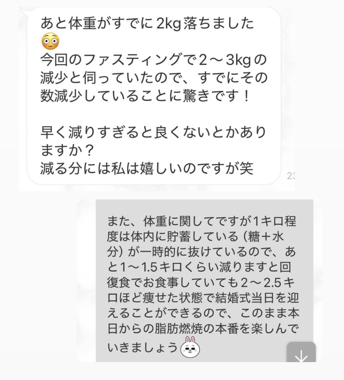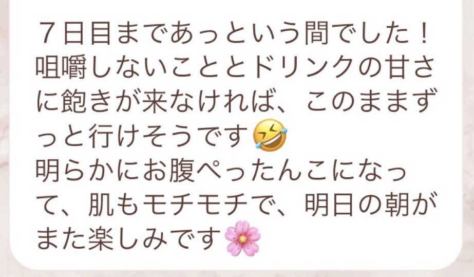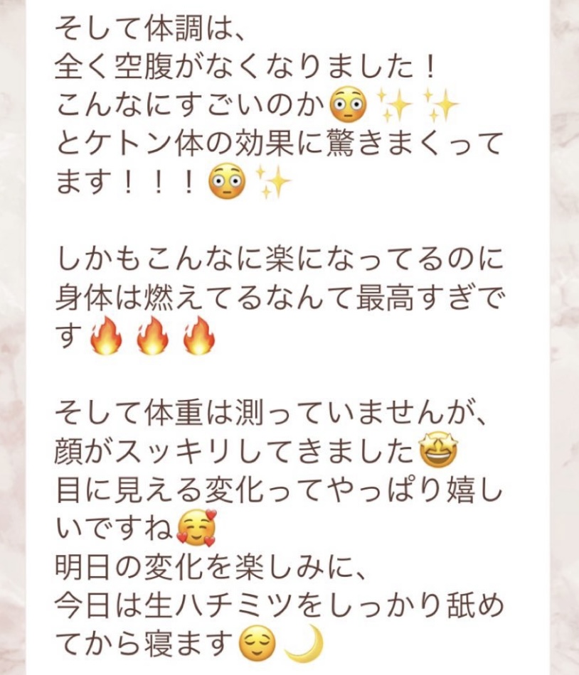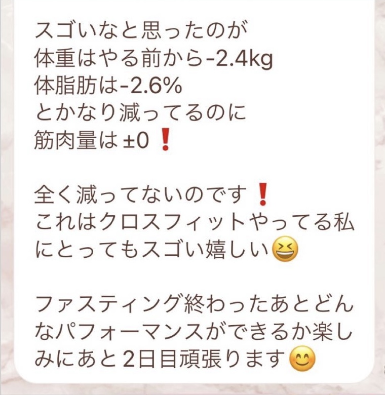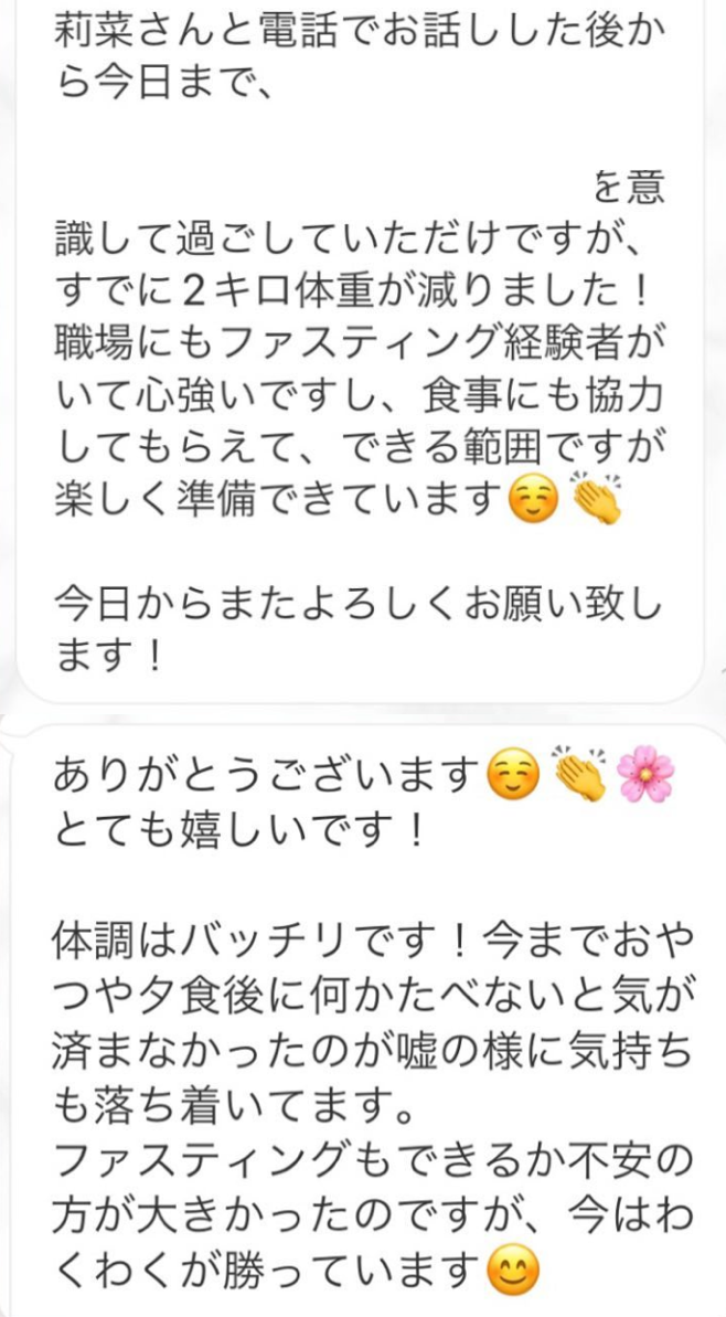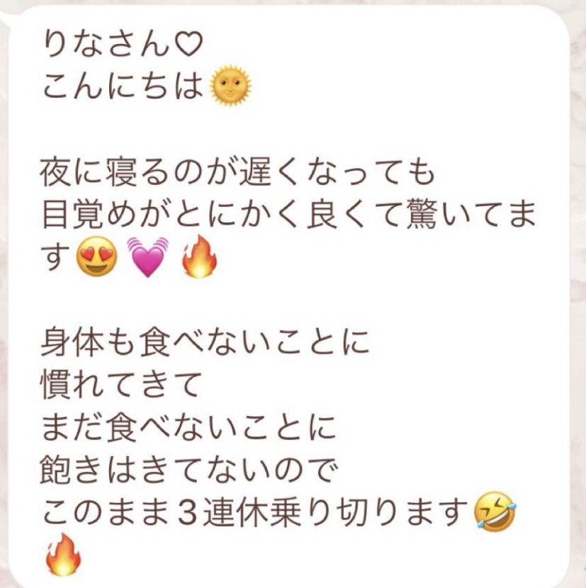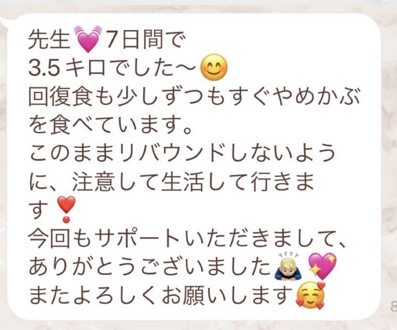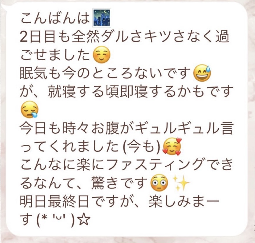 5日間の予定でしたが、とても身体が楽でまだまだできると思い、2日間延長しました。7日間で➖3キロ。毎日りな先生から丁寧にメッセージを送って頂き、よし!今日も身体がキレイになってるんだ!と毎日楽しく過ごすできました。ファスティング中もジムへ行き、普段よりも元気!!って感じでした。こんな時はどうしたらいいの?と思った時も、丁寧に説明していただき安心できました。簡単に短期間で安全に痩せられる。これ以上いいものはないですね🎶