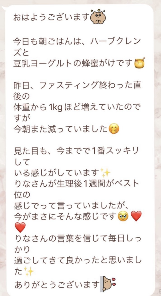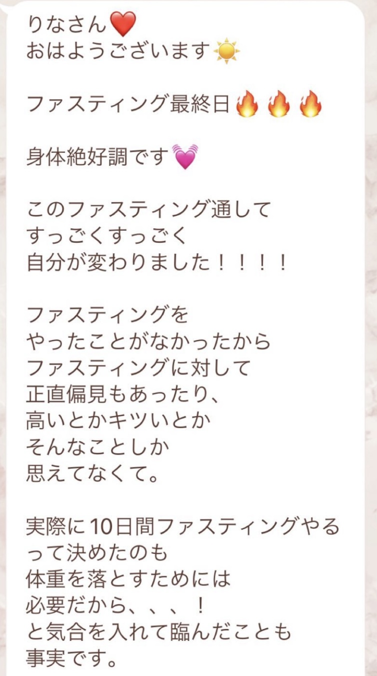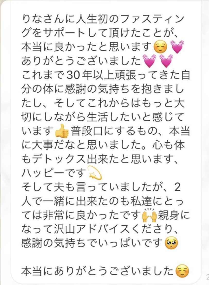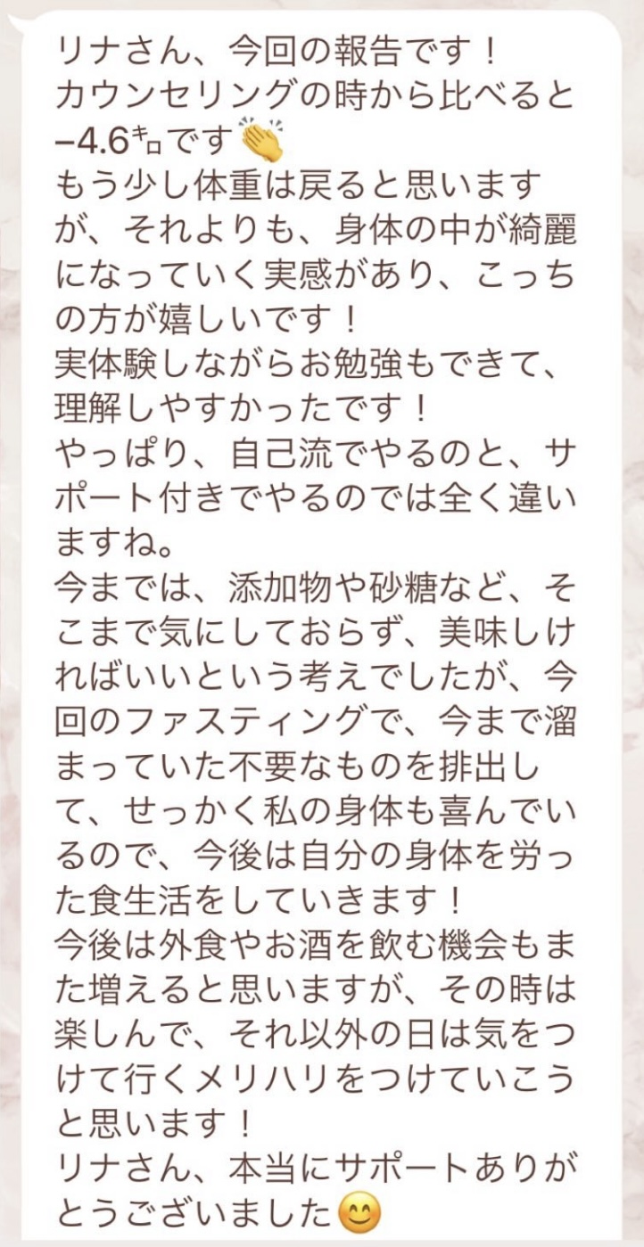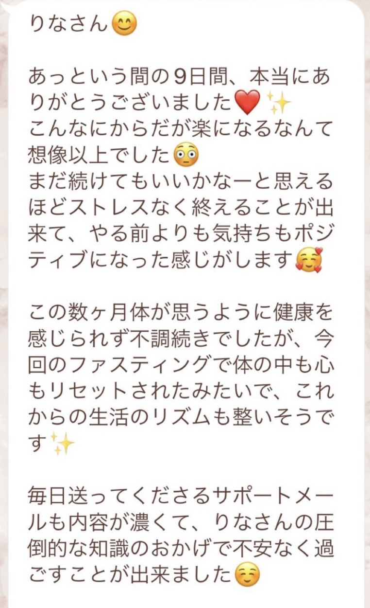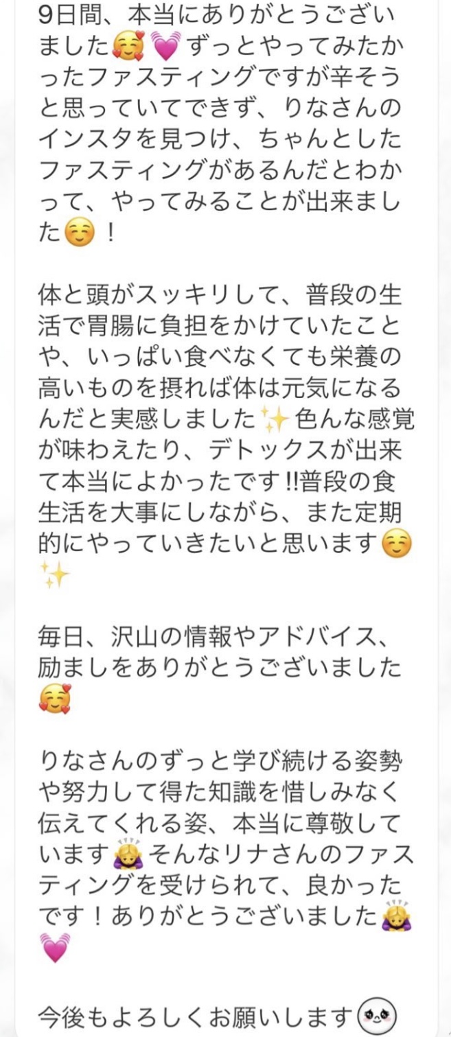 私は2.3年前から、自分がしていたエステのお客様から、りなさんのファスティングの実体験を聞き、その方がインスタにメンション載せていた事から、私もフォローさせて頂き、りなさんのインスタを見て、栄養知識が半端じゃなく、常に学んでいるし、本当にすごい方だなぁと思って、みていました(^^)でも1番短いファスティング3日間でも、知識量すごいりなさんのサポート付なので、安くはない金額だし、手は出せずにいました。初めての出産して2年ちょっと、娘がまだ保育園に行っていないので家で見ている毎日だと、夫の晩御飯、お弁当を作るのでいっぱいいっぱいで自分が食べる食事の栄養管理は子供ができる前より、やはり出来なくなり、そのせいか、腸の調子がここ2年くらい悪くて、立てないくらいの腹痛を起こしてお腹をくだしたり何回かあったりと、腸カメラをしても病気は見つからずで、腸内環境だいぶ悪いんだろうなと思いながら、りなさんのファスティングに申し込むことにしました!産後戻らない体型も変えたいのもありましたが、1番は身体の内側を良くしたいと、チャレンジスタート。りなさんのインスタで、いろんな人の体験談見ていたので、食べ物食べずに3日過ごせるのかという不安などは全然なく、りなさんのファスティングだから、むしろどう過ごせるのか楽しみ(^^)て気持ちでした♡3日間のファスティング終わってみて、改めて、本当に凄すぎると実感!!空腹感なし、1日目は多少、美味しいもの食べたいな〜。。と誘惑がありましたが、お腹ぐーぐー鳴るとかは私は全くなく!凄すぎる!笑2日目には水便も出始めて、オナラの匂いもいつもと違って、3日目は黒めの水便も!老廃物など、いろんな悪いものが出てるんだなって、嬉しくなり、りなさんに水便出るたび、報告してしまいました。笑りなさんのファスティングのいいところは、効果はもちろん、りなさんからのアドバイスをもらえること!私はエステの仕事を10年以上、個人でやっていたので、いろんな人と関わってきて、心が綺麗な人って、話していてわかるというか、なんといいますか、りなさんの人柄が大好きです!仕事だからアドバイスしている!って感じがなくて、LINEも絵文字たくさんついていて可愛いLINEで、お客さんに対する愛情がこもっているし、りなさんに褒めてもらえるととにかく嬉しかったんです。笑りなさんのファスティング本の、りなさんプロフィールをみて、私は3つ年上ですが、りなさんを心から尊敬しています!知識がすごいのに、まだまだ知識つけるために学びもしながら、お客さんのサポートもしていて、いろんなファスティング講師も育てているし、そんな凄すぎるりなさんにファスティングサポートをしてもらい、かなり充実した期間を過ごすことが出来ました!私は結構負けず嫌いで、頑固な性格なので、もし最初にグループファスティングをしていたら、自分より他の人の方が有酸素めちゃくちゃこなしていたりすると、私は全然ダメだなぁと比較して落ち込んでしまうところがあるのをわかっていたので(笑)、マンツーマンサポートでやらせていただきました(^^)家で子供をみながらでも、娘の昼寝中に有酸素をYouTubeでみながらやったり、3日目は娘が寝てから追い込み有酸素45分もやり切って、ファスティング終えることができました!これを機に、いろんな食材から良い栄養をたくさんとって、身体を大切にしていきたいなと改めて感じました。とっても長くなりましたが、ファスティングするなら、りなさん一択です。人柄が本当に素敵です。この度は本当にありがとうございました♡