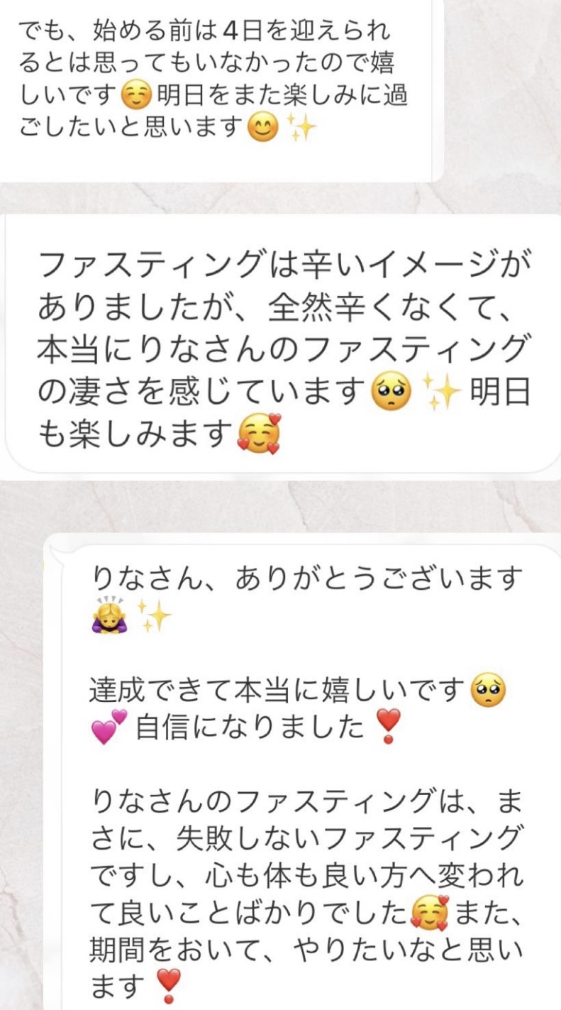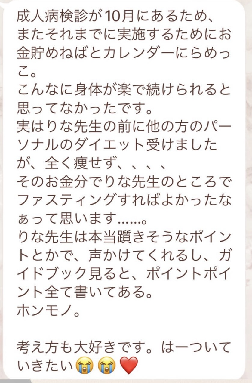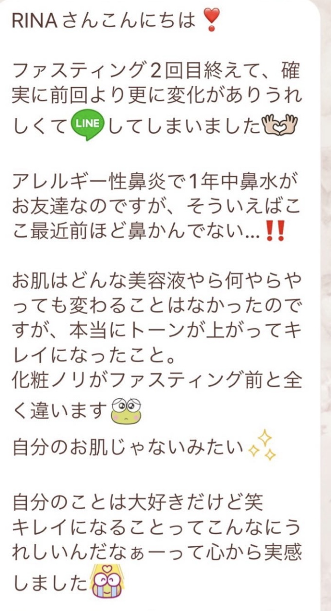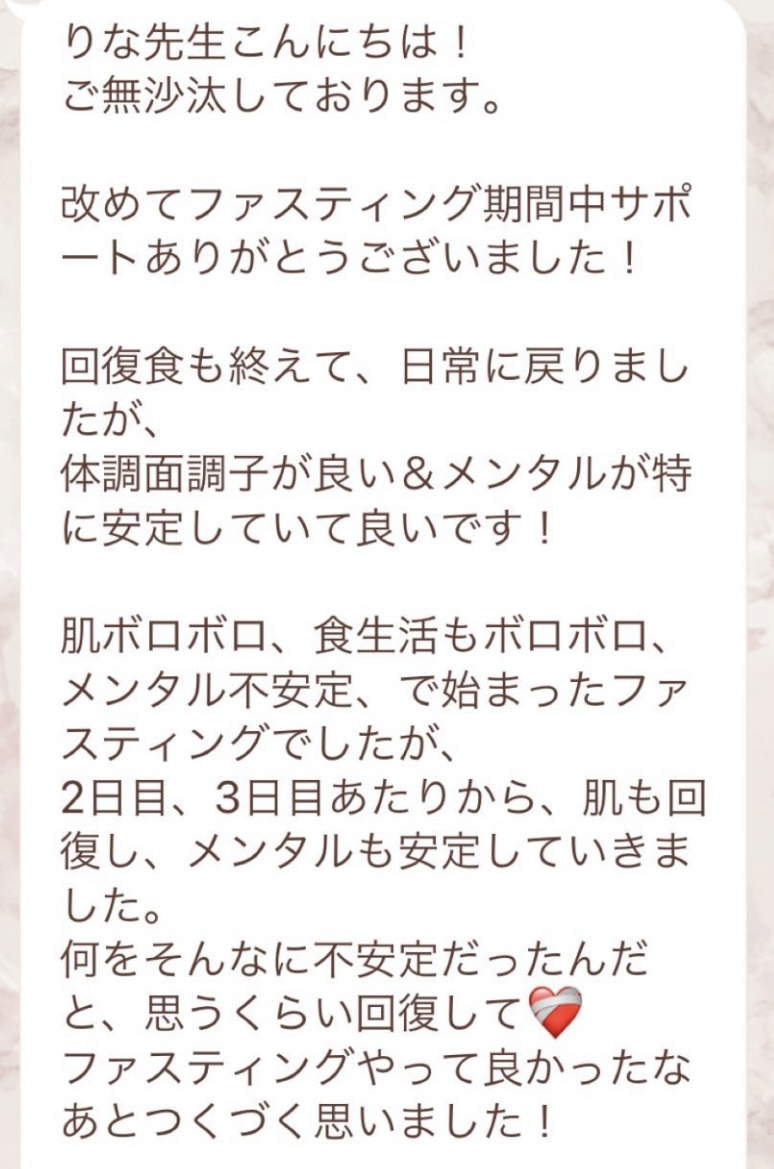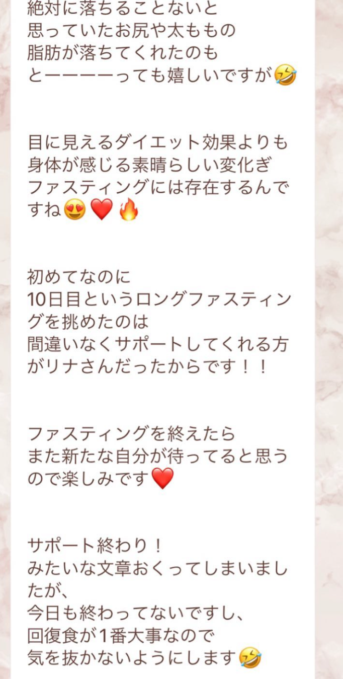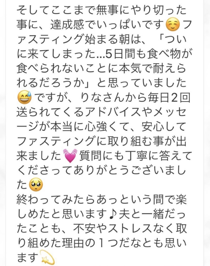 私は2.3年前から、自分がしていたエステのお客様から、りなさんのファスティングの実体験を聞き、その方がインスタにメンション載せていた事から、私もフォローさせて頂き、りなさんのインスタを見て、栄養知識が半端じゃなく、常に学んでいるし、本当にすごい方だなぁと思って、みていました(^^)でも1番短いファスティング3日間でも、知識量すごいりなさんのサポート付なので、安くはない金額だし、手は出せずにいました。初めての出産して2年ちょっと、娘がまだ保育園に行っていないので家で見ている毎日だと、夫の晩御飯、お弁当を作るのでいっぱいいっぱいで自分が食べる食事の栄養管理は子供ができる前より、やはり出来なくなり、そのせいか、腸の調子がここ2年くらい悪くて、立てないくらいの腹痛を起こしてお腹をくだしたり何回かあったりと、腸カメラをしても病気は見つからずで、腸内環境だいぶ悪いんだろうなと思いながら、りなさんのファスティングに申し込むことにしました!産後戻らない体型も変えたいのもありましたが、1番は身体の内側を良くしたいと、チャレンジスタート。りなさんのインスタで、いろんな人の体験談見ていたので、食べ物食べずに3日過ごせるのかという不安などは全然なく、りなさんのファスティングだから、むしろどう過ごせるのか楽しみ(^^)て気持ちでした♡3日間のファスティング終わってみて、改めて、本当に凄すぎると実感!!空腹感なし、1日目は多少、美味しいもの食べたいな〜。。と誘惑がありましたが、お腹ぐーぐー鳴るとかは私は全くなく!凄すぎる!笑2日目には水便も出始めて、オナラの匂いもいつもと違って、3日目は黒めの水便も!老廃物など、いろんな悪いものが出てるんだなって、嬉しくなり、りなさんに水便出るたび、報告してしまいました。笑りなさんのファスティングのいいところは、効果はもちろん、りなさんからのアドバイスをもらえること!私はエステの仕事を10年以上、個人でやっていたので、いろんな人と関わってきて、心が綺麗な人って、話していてわかるというか、なんといいますか、りなさんの人柄が大好きです!仕事だからアドバイスしている!って感じがなくて、LINEも絵文字たくさんついていて可愛いLINEで、お客さんに対する愛情がこもっているし、りなさんに褒めてもらえるととにかく嬉しかったんです。笑りなさんのファスティング本の、りなさんプロフィールをみて、私は3つ年上ですが、りなさんを心から尊敬しています!知識がすごいのに、まだまだ知識つけるために学びもしながら、お客さんのサポートもしていて、いろんなファスティング講師も育てているし、そんな凄すぎるりなさんにファスティングサポートをしてもらい、かなり充実した期間を過ごすことが出来ました!私は結構負けず嫌いで、頑固な性格なので、もし最初にグループファスティングをしていたら、自分より他の人の方が有酸素めちゃくちゃこなしていたりすると、私は全然ダメだなぁと比較して落ち込んでしまうところがあるのをわかっていたので(笑)、マンツーマンサポートでやらせていただきました(^^)家で子供をみながらでも、娘の昼寝中に有酸素をYouTubeでみながらやったり、3日目は娘が寝てから追い込み有酸素45分もやり切って、ファスティング終えることができました!これを機に、いろんな食材から良い栄養をたくさんとって、身体を大切にしていきたいなと改めて感じました。とっても長くなりましたが、ファスティングするなら、りなさん一択です。人柄が本当に素敵です。この度は本当にありがとうございました♡