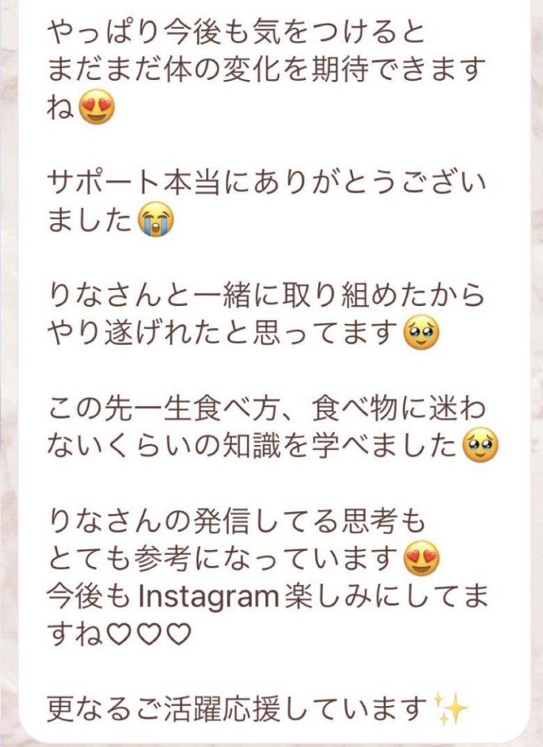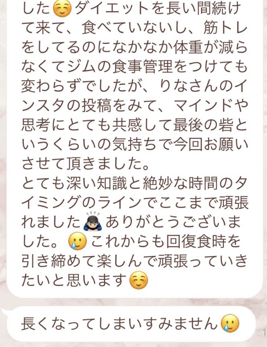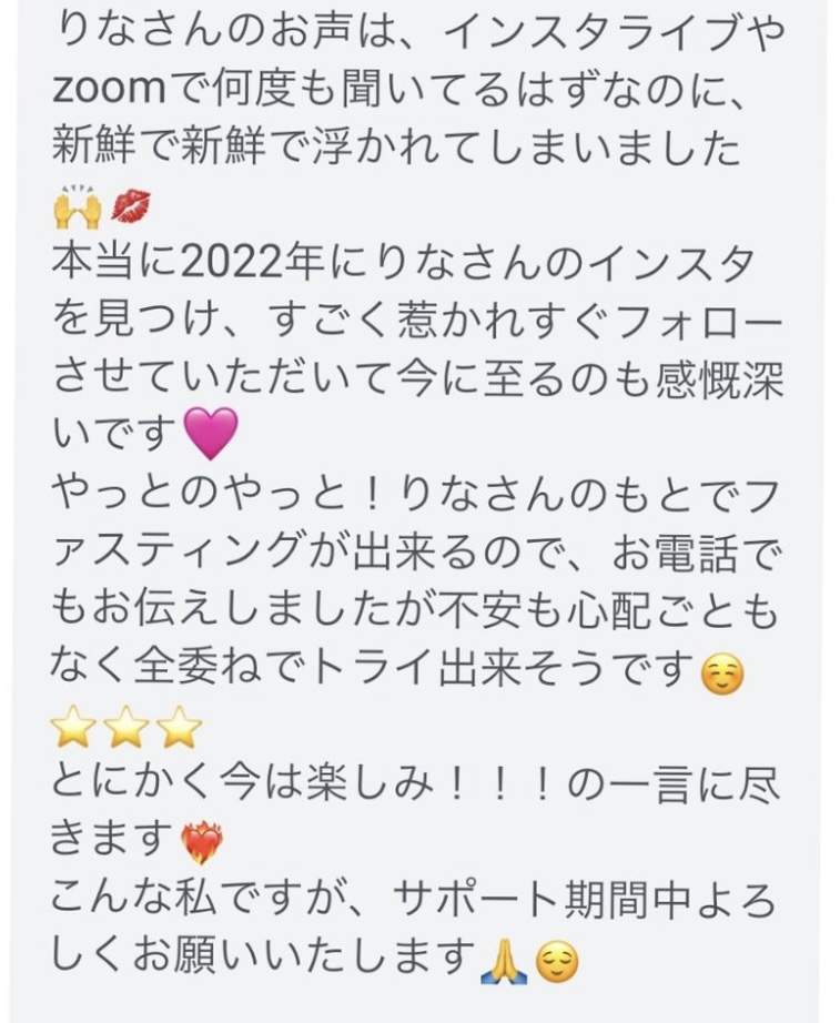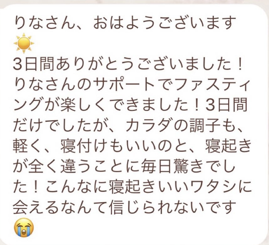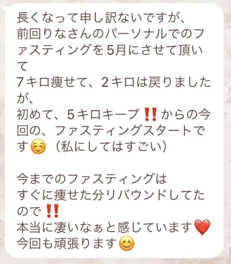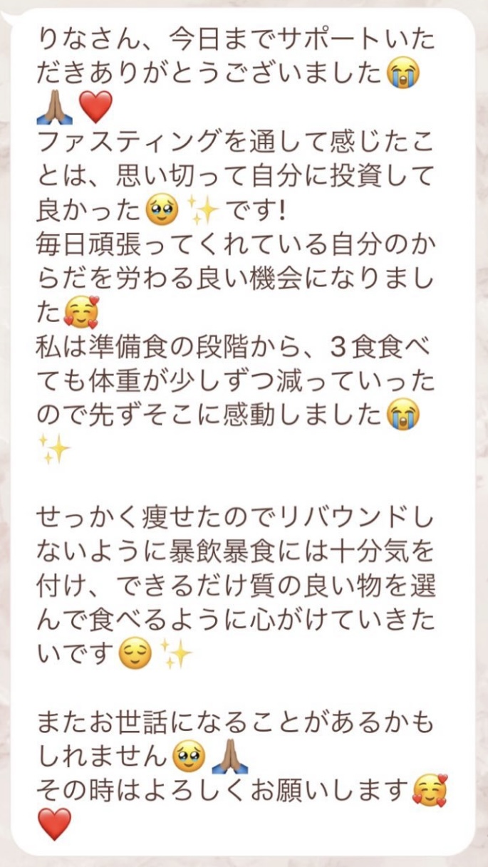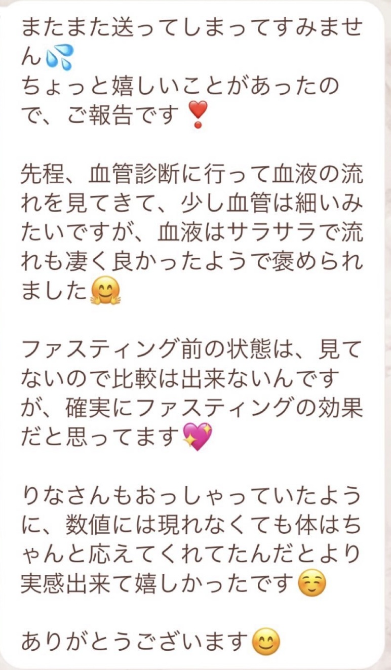 私は2.3年前から、自分がしていたエステのお客様から、りなさんのファスティングの実体験を聞き、その方がインスタにメンション載せていた事から、私もフォローさせて頂き、りなさんのインスタを見て、栄養知識が半端じゃなく、常に学んでいるし、本当にすごい方だなぁと思って、みていました(^^)でも1番短いファスティング3日間でも、知識量すごいりなさんのサポート付なので、安くはない金額だし、手は出せずにいました。初めての出産して2年ちょっと、娘がまだ保育園に行っていないので家で見ている毎日だと、夫の晩御飯、お弁当を作るのでいっぱいいっぱいで自分が食べる食事の栄養管理は子供ができる前より、やはり出来なくなり、そのせいか、腸の調子がここ2年くらい悪くて、立てないくらいの腹痛を起こしてお腹をくだしたり何回かあったりと、腸カメラをしても病気は見つからずで、腸内環境だいぶ悪いんだろうなと思いながら、りなさんのファスティングに申し込むことにしました!産後戻らない体型も変えたいのもありましたが、1番は身体の内側を良くしたいと、チャレンジスタート。りなさんのインスタで、いろんな人の体験談見ていたので、食べ物食べずに3日過ごせるのかという不安などは全然なく、りなさんのファスティングだから、むしろどう過ごせるのか楽しみ(^^)て気持ちでした♡3日間のファスティング終わってみて、改めて、本当に凄すぎると実感!!空腹感なし、1日目は多少、美味しいもの食べたいな〜。。と誘惑がありましたが、お腹ぐーぐー鳴るとかは私は全くなく!凄すぎる!笑2日目には水便も出始めて、オナラの匂いもいつもと違って、3日目は黒めの水便も!老廃物など、いろんな悪いものが出てるんだなって、嬉しくなり、りなさんに水便出るたび、報告してしまいました。笑りなさんのファスティングのいいところは、効果はもちろん、りなさんからのアドバイスをもらえること!私はエステの仕事を10年以上、個人でやっていたので、いろんな人と関わってきて、心が綺麗な人って、話していてわかるというか、なんといいますか、りなさんの人柄が大好きです!仕事だからアドバイスしている!って感じがなくて、LINEも絵文字たくさんついていて可愛いLINEで、お客さんに対する愛情がこもっているし、りなさんに褒めてもらえるととにかく嬉しかったんです。笑りなさんのファスティング本の、りなさんプロフィールをみて、私は3つ年上ですが、りなさんを心から尊敬しています!知識がすごいのに、まだまだ知識つけるために学びもしながら、お客さんのサポートもしていて、いろんなファスティング講師も育てているし、そんな凄すぎるりなさんにファスティングサポートをしてもらい、かなり充実した期間を過ごすことが出来ました!私は結構負けず嫌いで、頑固な性格なので、もし最初にグループファスティングをしていたら、自分より他の人の方が有酸素めちゃくちゃこなしていたりすると、私は全然ダメだなぁと比較して落ち込んでしまうところがあるのをわかっていたので(笑)、マンツーマンサポートでやらせていただきました(^^)家で子供をみながらでも、娘の昼寝中に有酸素をYouTubeでみながらやったり、3日目は娘が寝てから追い込み有酸素45分もやり切って、ファスティング終えることができました!これを機に、いろんな食材から良い栄養をたくさんとって、身体を大切にしていきたいなと改めて感じました。とっても長くなりましたが、ファスティングするなら、りなさん一択です。人柄が本当に素敵です。この度は本当にありがとうございました♡