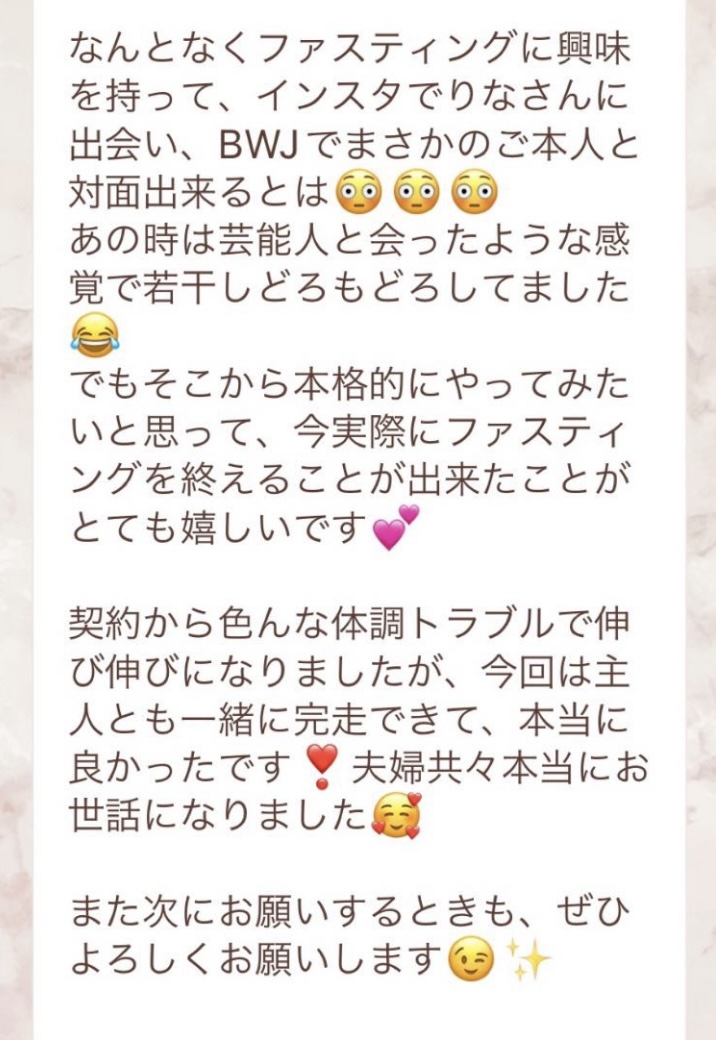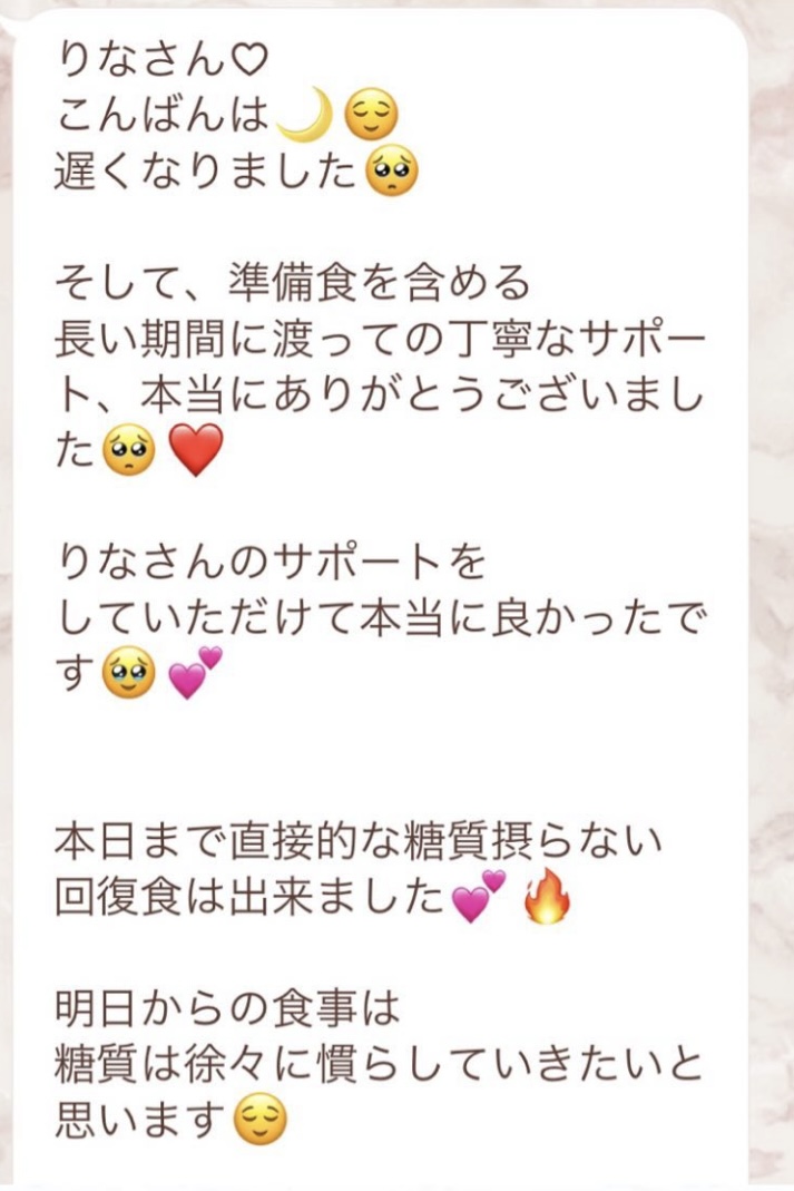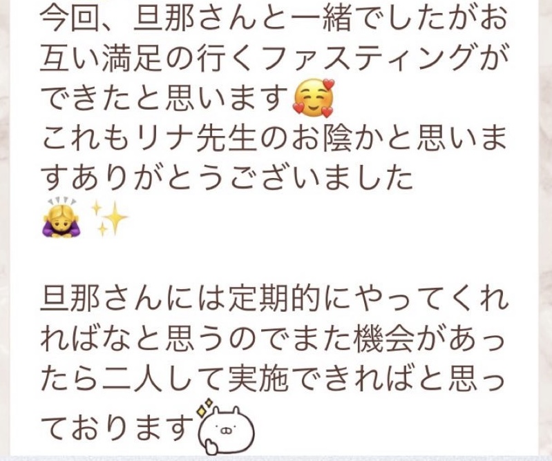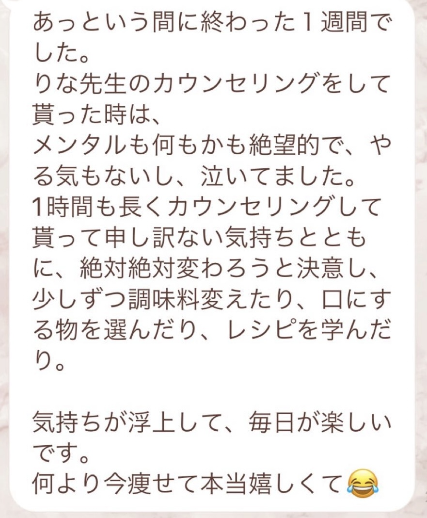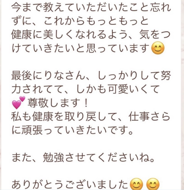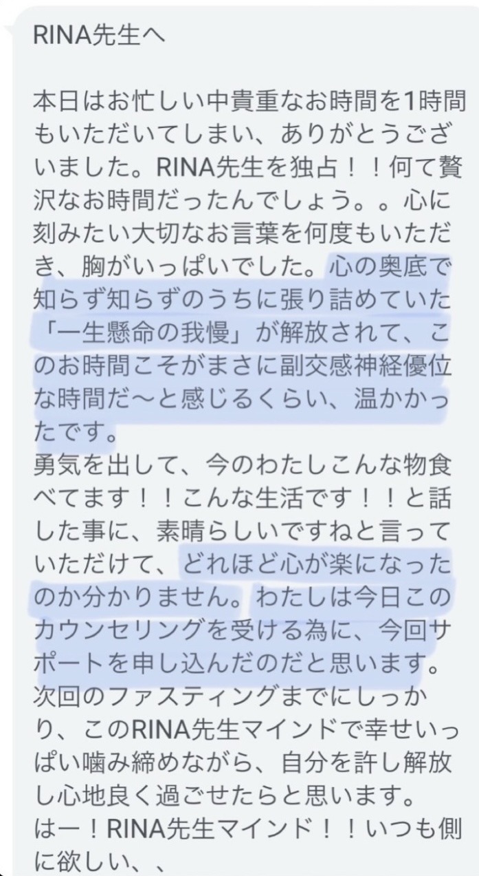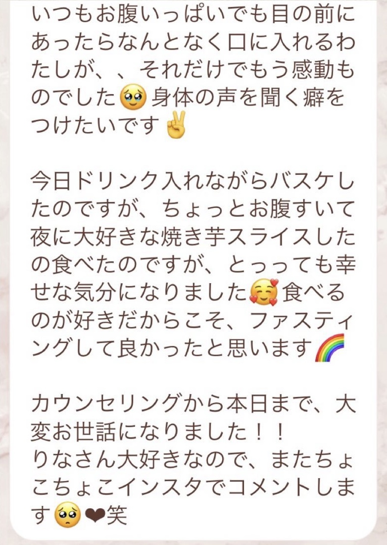 私は2.3年前から、自分がしていたエステのお客様から、りなさんのファスティングの実体験を聞き、その方がインスタにメンション載せていた事から、私もフォローさせて頂き、りなさんのインスタを見て、栄養知識が半端じゃなく、常に学んでいるし、本当にすごい方だなぁと思って、みていました(^^)でも1番短いファスティング3日間でも、知識量すごいりなさんのサポート付なので、安くはない金額だし、手は出せずにいました。初めての出産して2年ちょっと、娘がまだ保育園に行っていないので家で見ている毎日だと、夫の晩御飯、お弁当を作るのでいっぱいいっぱいで自分が食べる食事の栄養管理は子供ができる前より、やはり出来なくなり、そのせいか、腸の調子がここ2年くらい悪くて、立てないくらいの腹痛を起こしてお腹をくだしたり何回かあったりと、腸カメラをしても病気は見つからずで、腸内環境だいぶ悪いんだろうなと思いながら、りなさんのファスティングに申し込むことにしました!産後戻らない体型も変えたいのもありましたが、1番は身体の内側を良くしたいと、チャレンジスタート。りなさんのインスタで、いろんな人の体験談見ていたので、食べ物食べずに3日過ごせるのかという不安などは全然なく、りなさんのファスティングだから、むしろどう過ごせるのか楽しみ(^^)て気持ちでした♡3日間のファスティング終わってみて、改めて、本当に凄すぎると実感!!空腹感なし、1日目は多少、美味しいもの食べたいな〜。。と誘惑がありましたが、お腹ぐーぐー鳴るとかは私は全くなく!凄すぎる!笑2日目には水便も出始めて、オナラの匂いもいつもと違って、3日目は黒めの水便も!老廃物など、いろんな悪いものが出てるんだなって、嬉しくなり、りなさんに水便出るたび、報告してしまいました。笑りなさんのファスティングのいいところは、効果はもちろん、りなさんからのアドバイスをもらえること!私はエステの仕事を10年以上、個人でやっていたので、いろんな人と関わってきて、心が綺麗な人って、話していてわかるというか、なんといいますか、りなさんの人柄が大好きです!仕事だからアドバイスしている!って感じがなくて、LINEも絵文字たくさんついていて可愛いLINEで、お客さんに対する愛情がこもっているし、りなさんに褒めてもらえるととにかく嬉しかったんです。笑りなさんのファスティング本の、りなさんプロフィールをみて、私は3つ年上ですが、りなさんを心から尊敬しています!知識がすごいのに、まだまだ知識つけるために学びもしながら、お客さんのサポートもしていて、いろんなファスティング講師も育てているし、そんな凄すぎるりなさんにファスティングサポートをしてもらい、かなり充実した期間を過ごすことが出来ました!私は結構負けず嫌いで、頑固な性格なので、もし最初にグループファスティングをしていたら、自分より他の人の方が有酸素めちゃくちゃこなしていたりすると、私は全然ダメだなぁと比較して落ち込んでしまうところがあるのをわかっていたので(笑)、マンツーマンサポートでやらせていただきました(^^)家で子供をみながらでも、娘の昼寝中に有酸素をYouTubeでみながらやったり、3日目は娘が寝てから追い込み有酸素45分もやり切って、ファスティング終えることができました!これを機に、いろんな食材から良い栄養をたくさんとって、身体を大切にしていきたいなと改めて感じました。とっても長くなりましたが、ファスティングするなら、りなさん一択です。人柄が本当に素敵です。この度は本当にありがとうございました♡