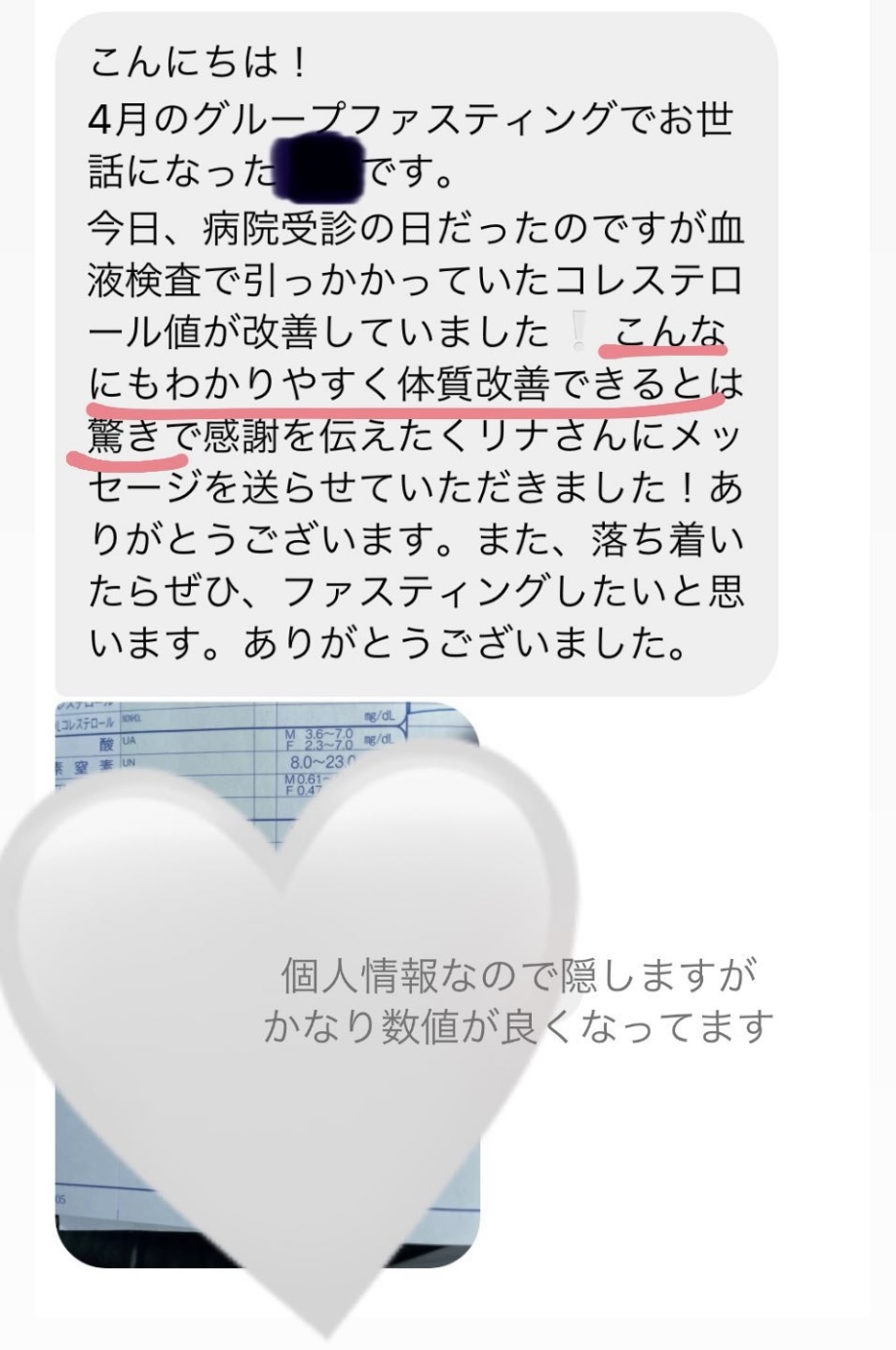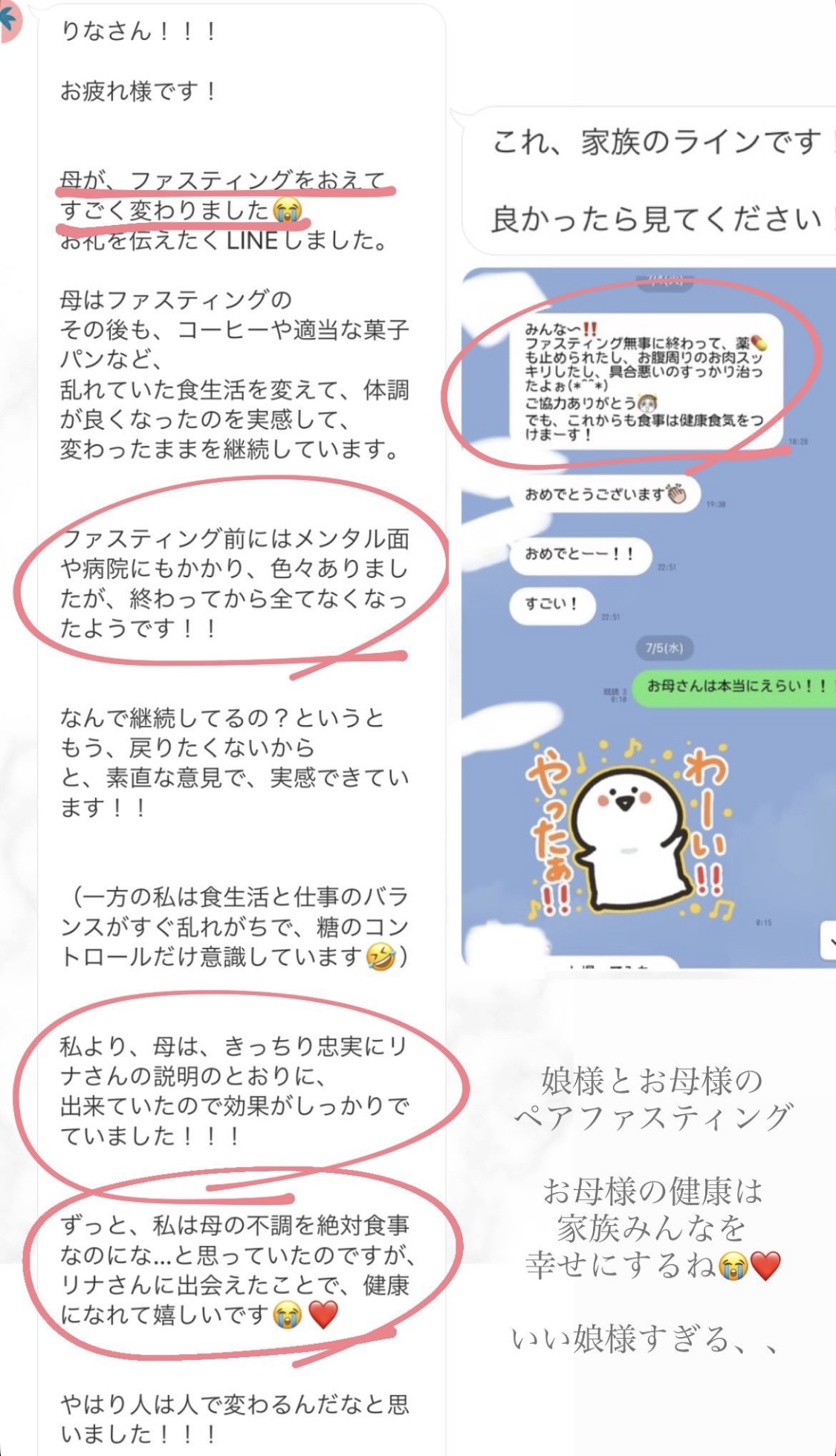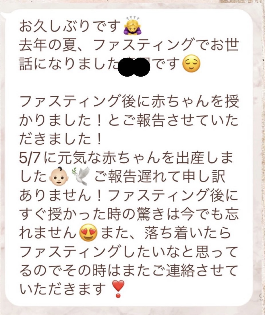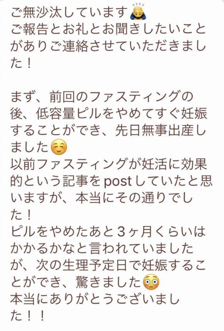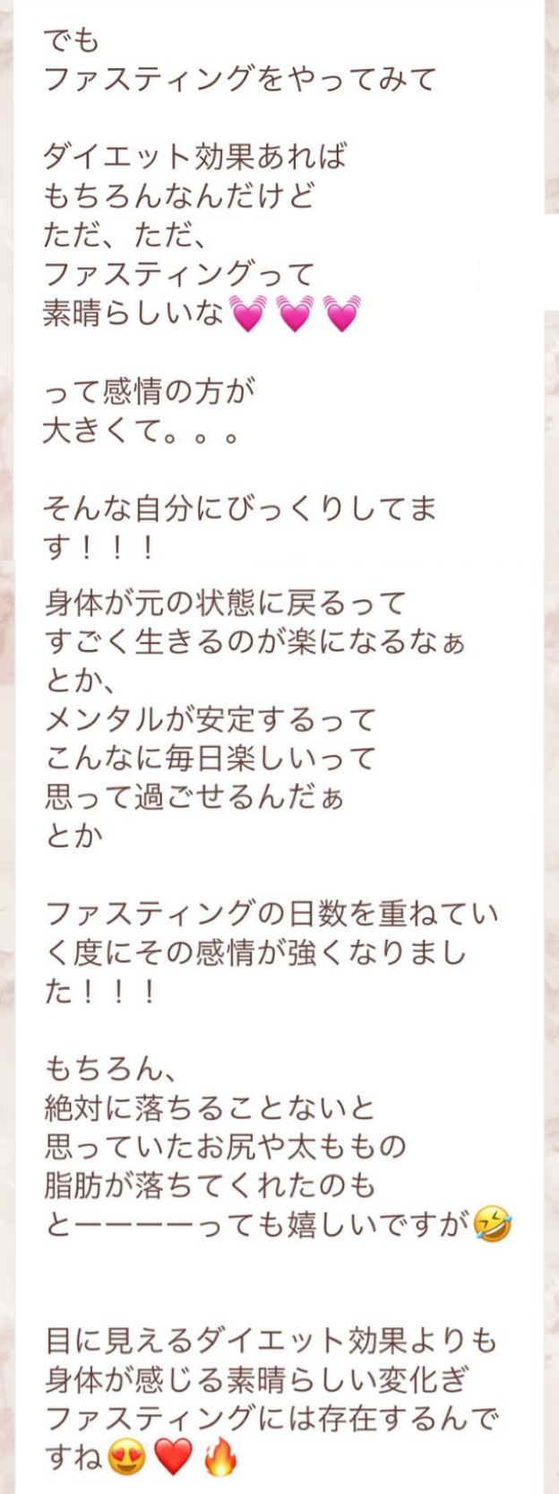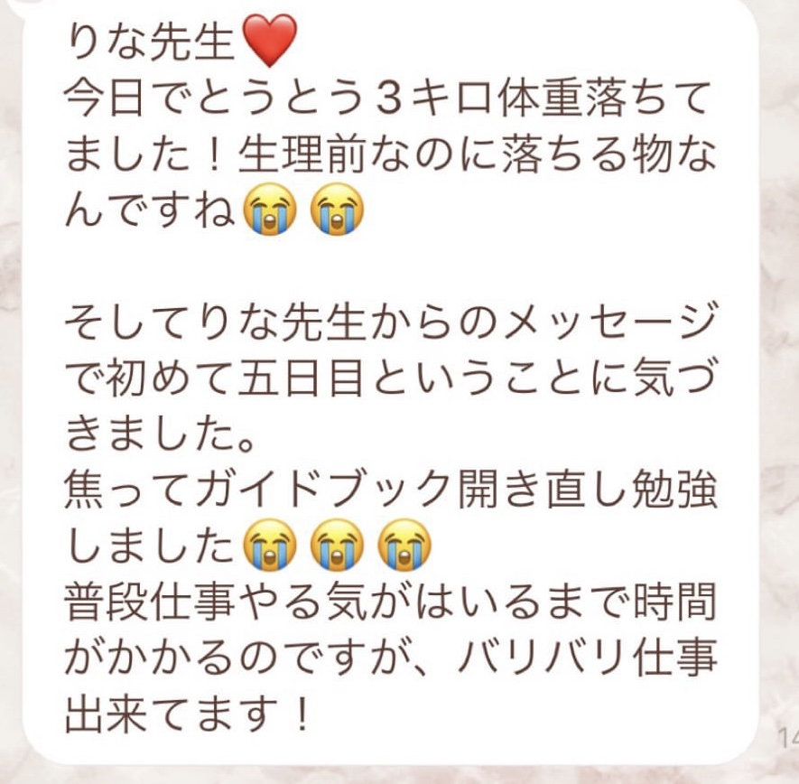 私は2.3年前から、自分がしていたエステのお客様から、りなさんのファスティングの実体験を聞き、その方がインスタにメンション載せていた事から、私もフォローさせて頂き、りなさんのインスタを見て、栄養知識が半端じゃなく、常に学んでいるし、本当にすごい方だなぁと思って、みていました(^^)でも1番短いファスティング3日間でも、知識量すごいりなさんのサポート付なので、安くはない金額だし、手は出せずにいました。初めての出産して2年ちょっと、娘がまだ保育園に行っていないので家で見ている毎日だと、夫の晩御飯、お弁当を作るのでいっぱいいっぱいで自分が食べる食事の栄養管理は子供ができる前より、やはり出来なくなり、そのせいか、腸の調子がここ2年くらい悪くて、立てないくらいの腹痛を起こしてお腹をくだしたり何回かあったりと、腸カメラをしても病気は見つからずで、腸内環境だいぶ悪いんだろうなと思いながら、りなさんのファスティングに申し込むことにしました!産後戻らない体型も変えたいのもありましたが、1番は身体の内側を良くしたいと、チャレンジスタート。りなさんのインスタで、いろんな人の体験談見ていたので、食べ物食べずに3日過ごせるのかという不安などは全然なく、りなさんのファスティングだから、むしろどう過ごせるのか楽しみ(^^)て気持ちでした♡3日間のファスティング終わってみて、改めて、本当に凄すぎると実感!!空腹感なし、1日目は多少、美味しいもの食べたいな〜。。と誘惑がありましたが、お腹ぐーぐー鳴るとかは私は全くなく!凄すぎる!笑2日目には水便も出始めて、オナラの匂いもいつもと違って、3日目は黒めの水便も!老廃物など、いろんな悪いものが出てるんだなって、嬉しくなり、りなさんに水便出るたび、報告してしまいました。笑りなさんのファスティングのいいところは、効果はもちろん、りなさんからのアドバイスをもらえること!私はエステの仕事を10年以上、個人でやっていたので、いろんな人と関わってきて、心が綺麗な人って、話していてわかるというか、なんといいますか、りなさんの人柄が大好きです!仕事だからアドバイスしている!って感じがなくて、LINEも絵文字たくさんついていて可愛いLINEで、お客さんに対する愛情がこもっているし、りなさんに褒めてもらえるととにかく嬉しかったんです。笑りなさんのファスティング本の、りなさんプロフィールをみて、私は3つ年上ですが、りなさんを心から尊敬しています!知識がすごいのに、まだまだ知識つけるために学びもしながら、お客さんのサポートもしていて、いろんなファスティング講師も育てているし、そんな凄すぎるりなさんにファスティングサポートをしてもらい、かなり充実した期間を過ごすことが出来ました!私は結構負けず嫌いで、頑固な性格なので、もし最初にグループファスティングをしていたら、自分より他の人の方が有酸素めちゃくちゃこなしていたりすると、私は全然ダメだなぁと比較して落ち込んでしまうところがあるのをわかっていたので(笑)、マンツーマンサポートでやらせていただきました(^^)家で子供をみながらでも、娘の昼寝中に有酸素をYouTubeでみながらやったり、3日目は娘が寝てから追い込み有酸素45分もやり切って、ファスティング終えることができました!これを機に、いろんな食材から良い栄養をたくさんとって、身体を大切にしていきたいなと改めて感じました。とっても長くなりましたが、ファスティングするなら、りなさん一択です。人柄が本当に素敵です。この度は本当にありがとうございました♡