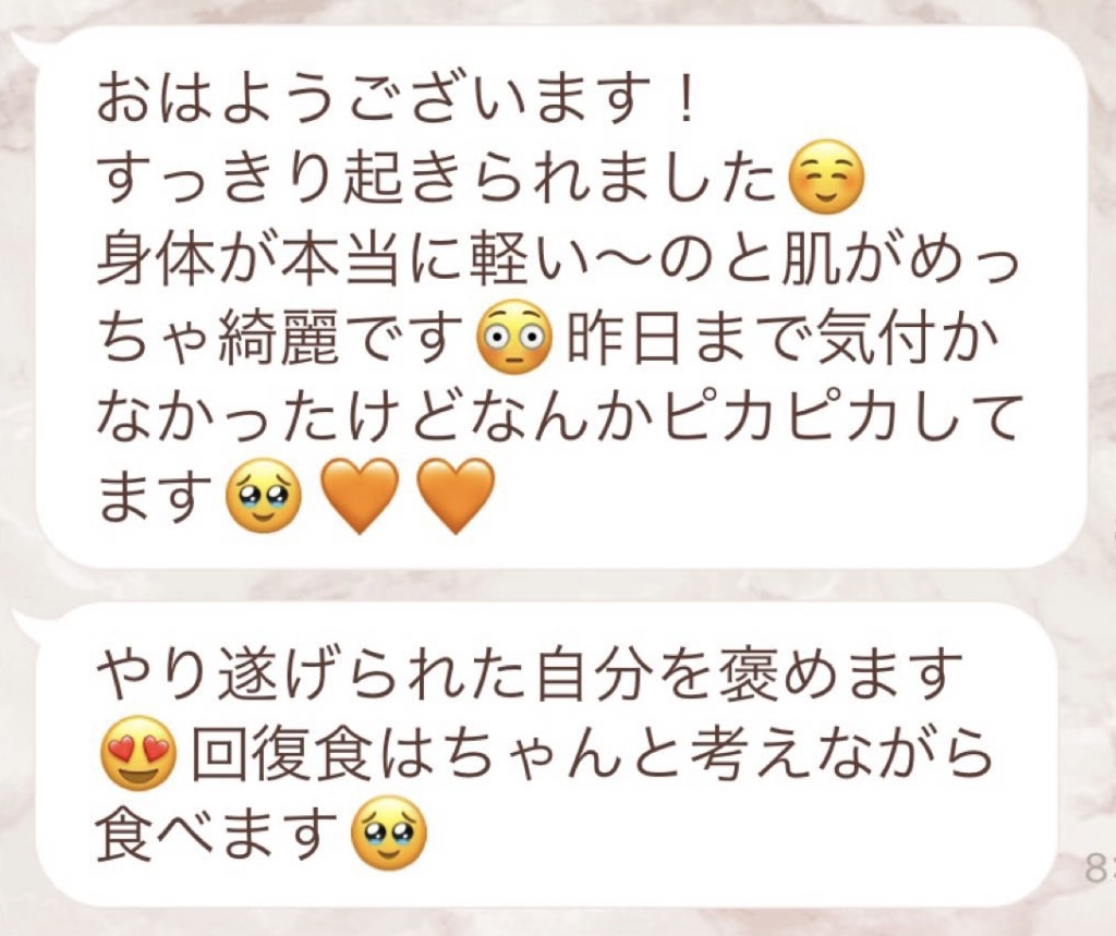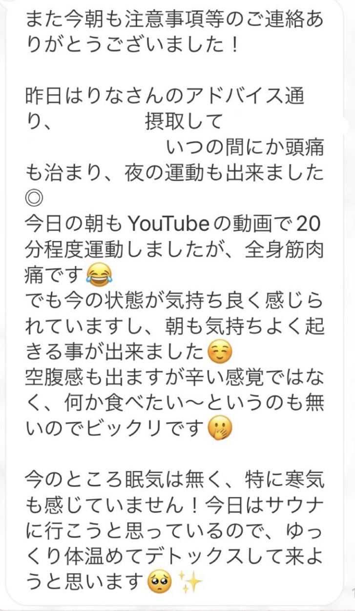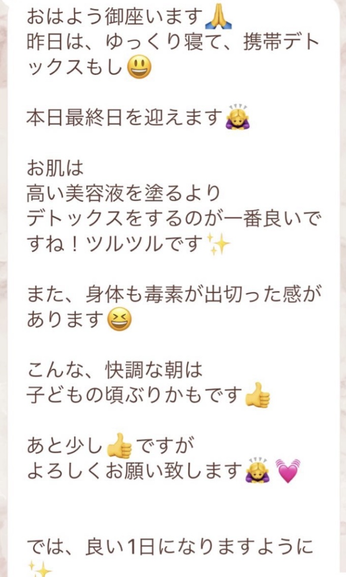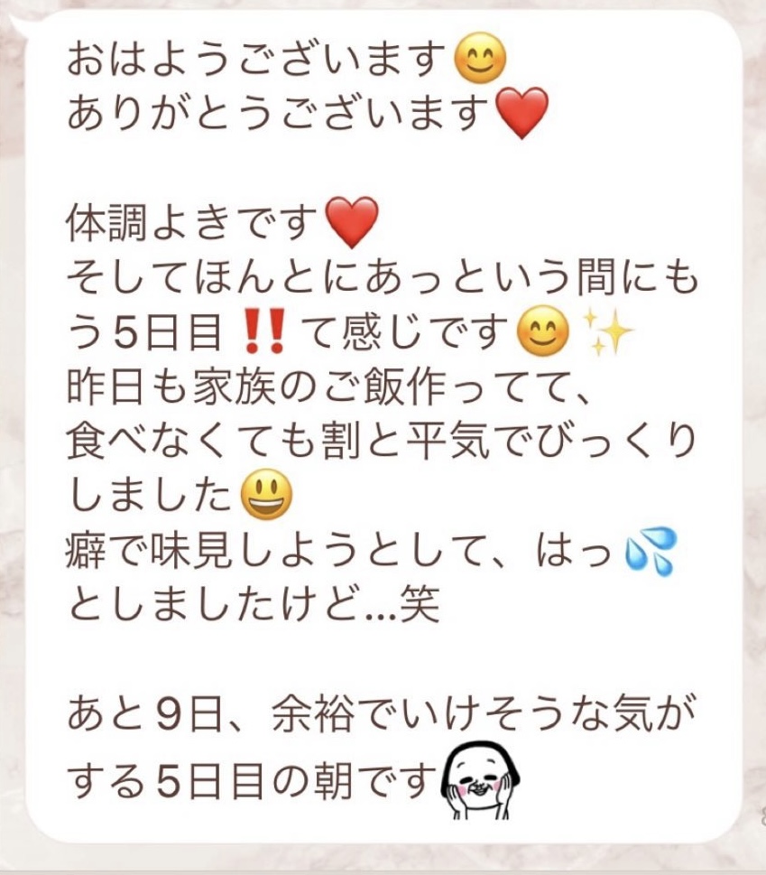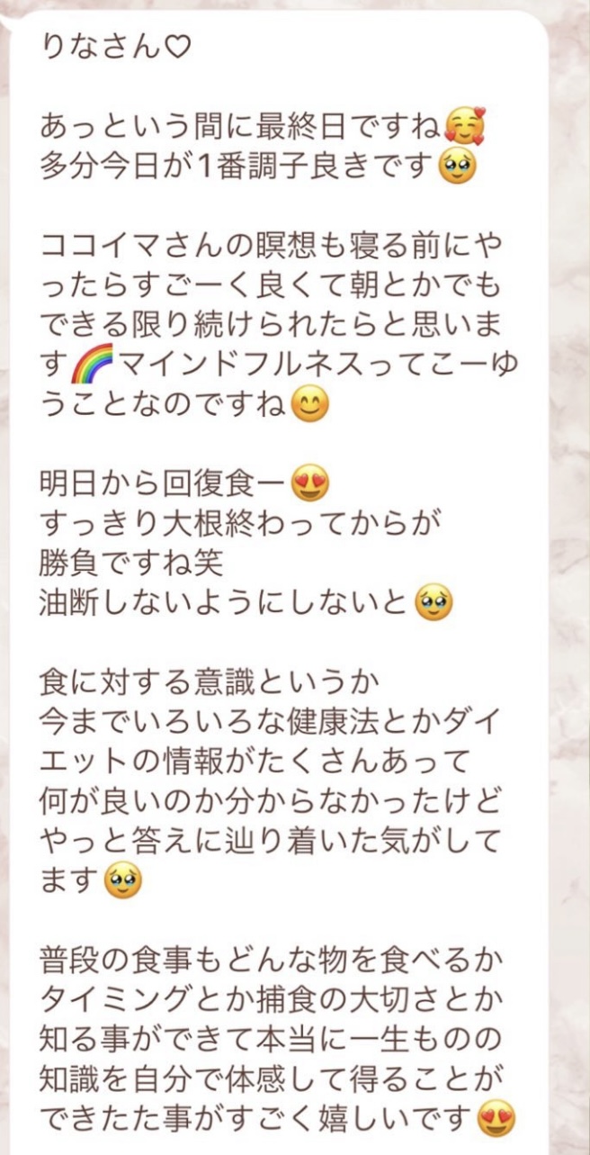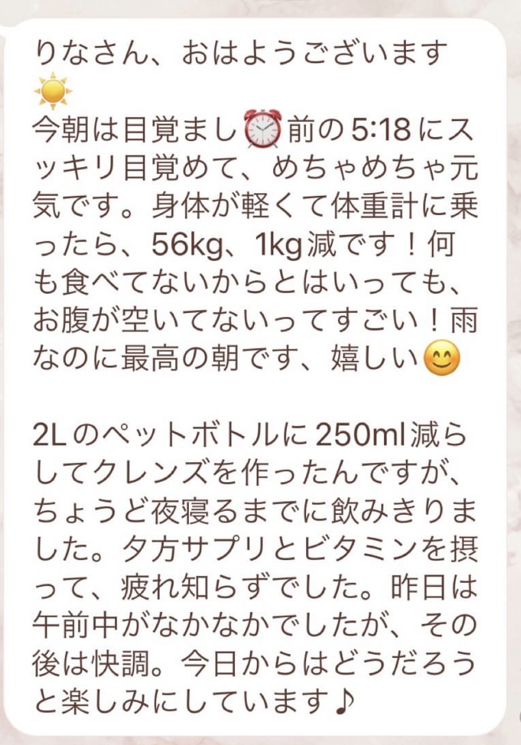 1人では途中で断念してしまいそうになる5日間のファスティングですが、みんなでやってるからこそ頑張れました!毎日Rinaさんからいただくメッセージに今日も一日頑張ろう、明日の朝が楽しみだ!と思えました。ありがとうございました!