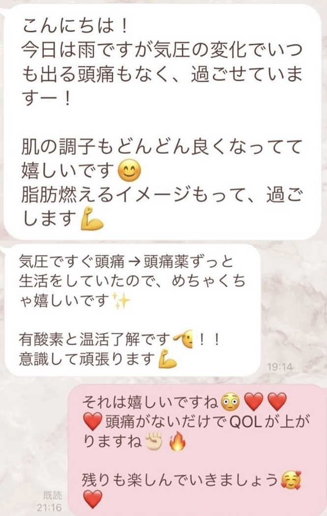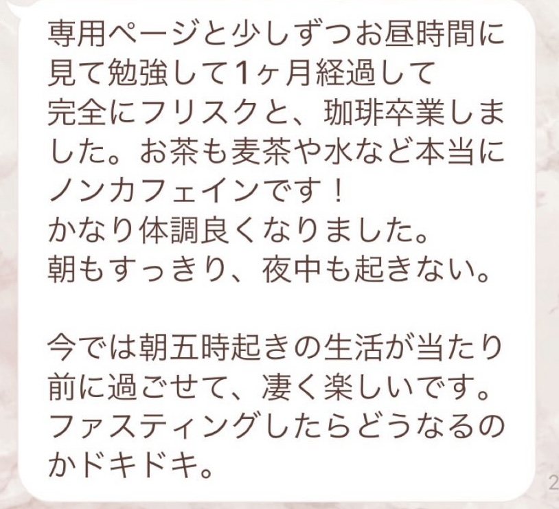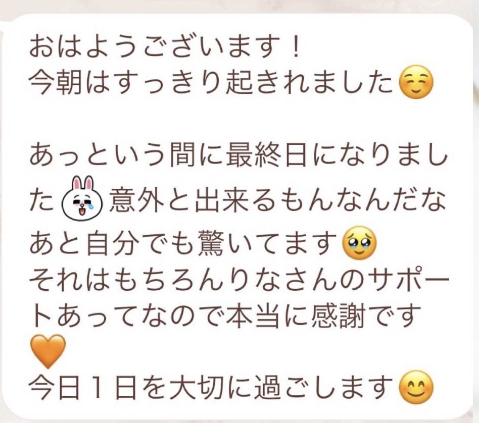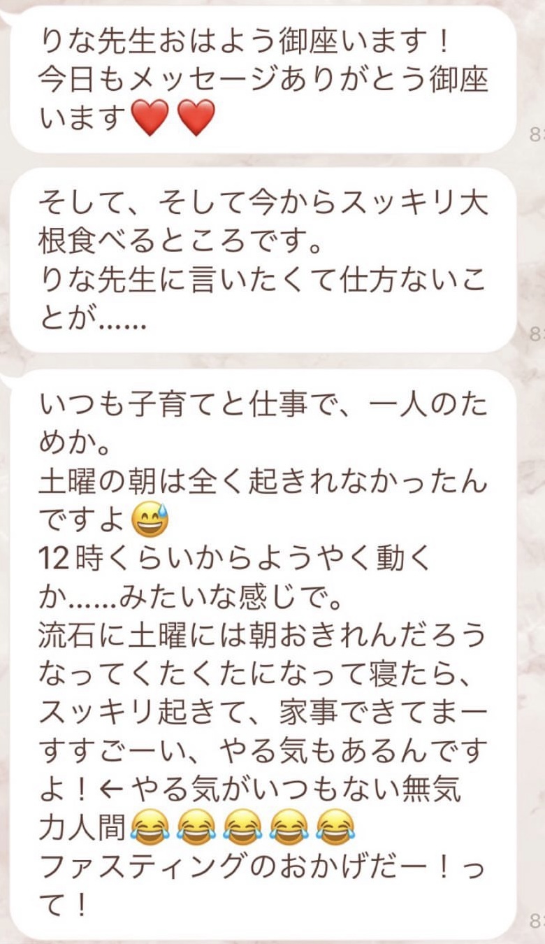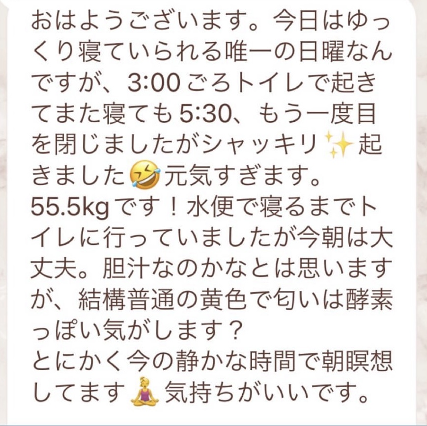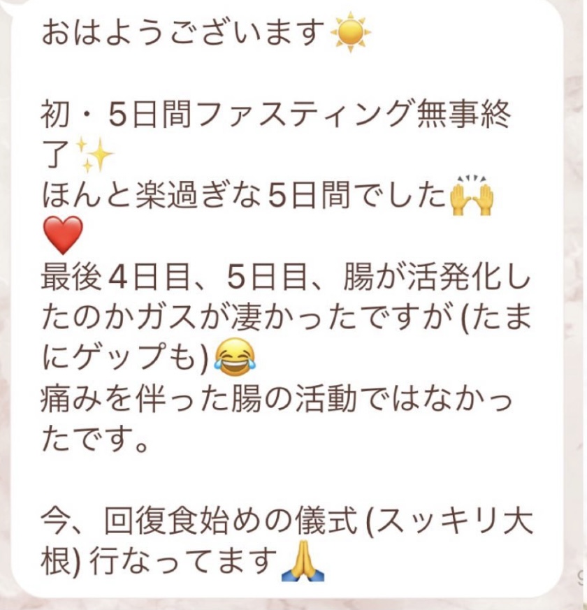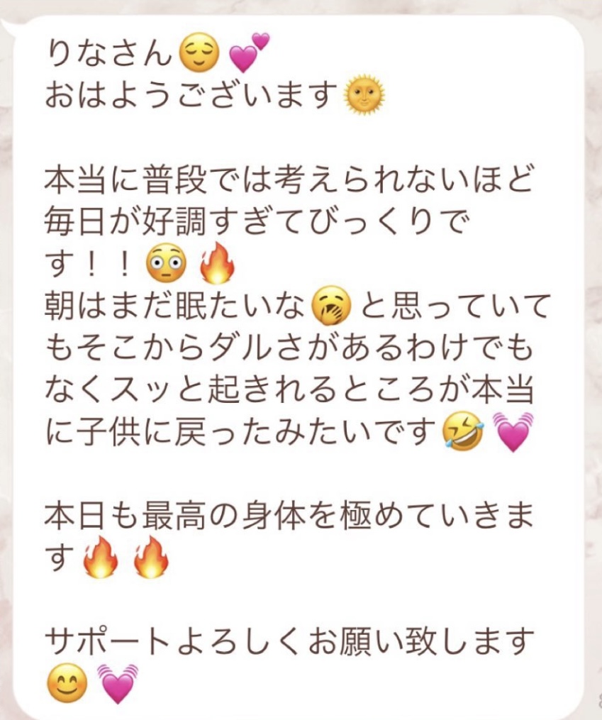 1人では途中で断念してしまいそうになる5日間のファスティングですが、みんなでやってるからこそ頑張れました!毎日Rinaさんからいただくメッセージに今日も一日頑張ろう、明日の朝が楽しみだ!と思えました。ありがとうございました!