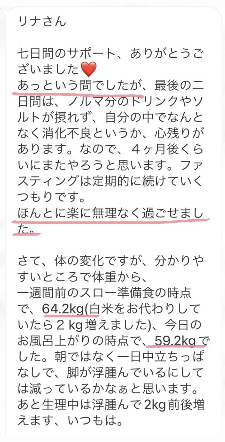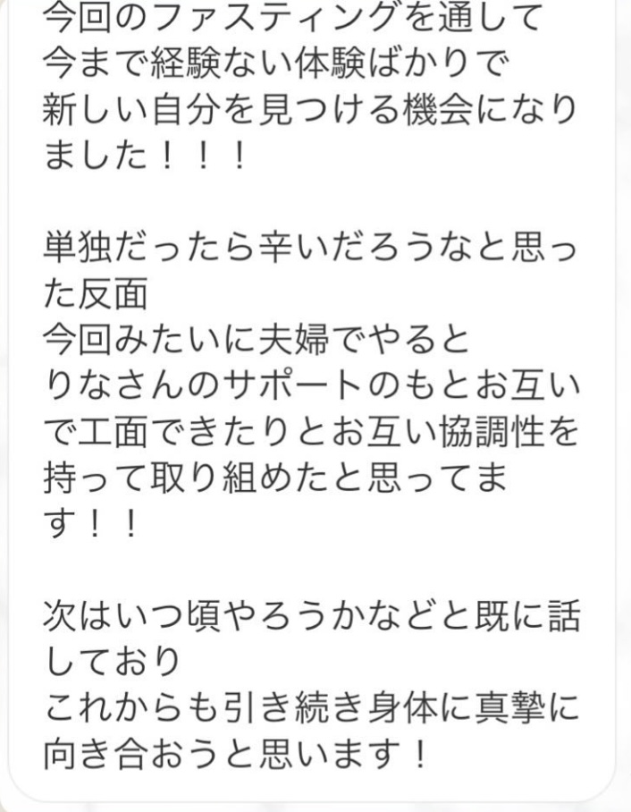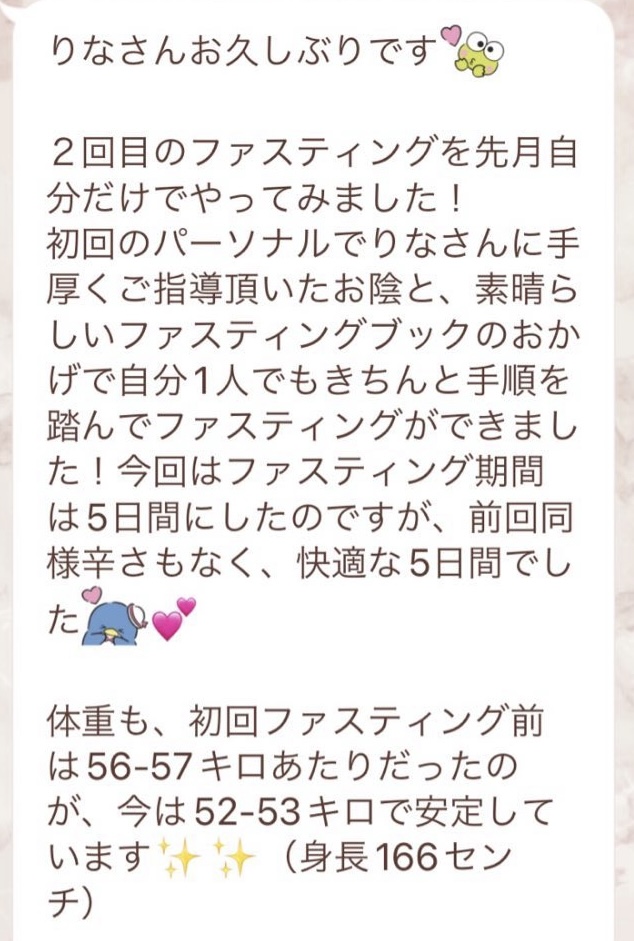 3年ぶり2回目のファスティングでした!今回は7日間に挑戦しました。1回目のファスティングがすごく良かったので、2回目も絶対にまたりなさんの元でと思っていました。なかなか良いタイミングがなかったけど、今回グループファスティングをすると言うことで、友達と一緒に申し込みました!やっぱりりなさんのサポートは最強です。知識が本当に豊富で、毎日のサポートラインの内容も熟読するほどの情報量だし、質問に対してもとても丁寧にお返事くださいます。徹底されたサポートのおかげでファスティング中は快適に過ごせました。もし何か体調に異変があっても、りなさんに質問すれば解決できるという安心感も常にあるので7日間無敵でした!グループファスティングということで日程が大まかに決まっていたので、私は生理前のファスティングになり体重の変化はそんなにありませんでした。でもその理由も丁寧に教えてくださり、ガッカリ感もなく終えることができました。とても楽しくファスティングできました!ありがとうございました。ファスティングをするなら絶対にりなさんのサポートをおすすめします!!