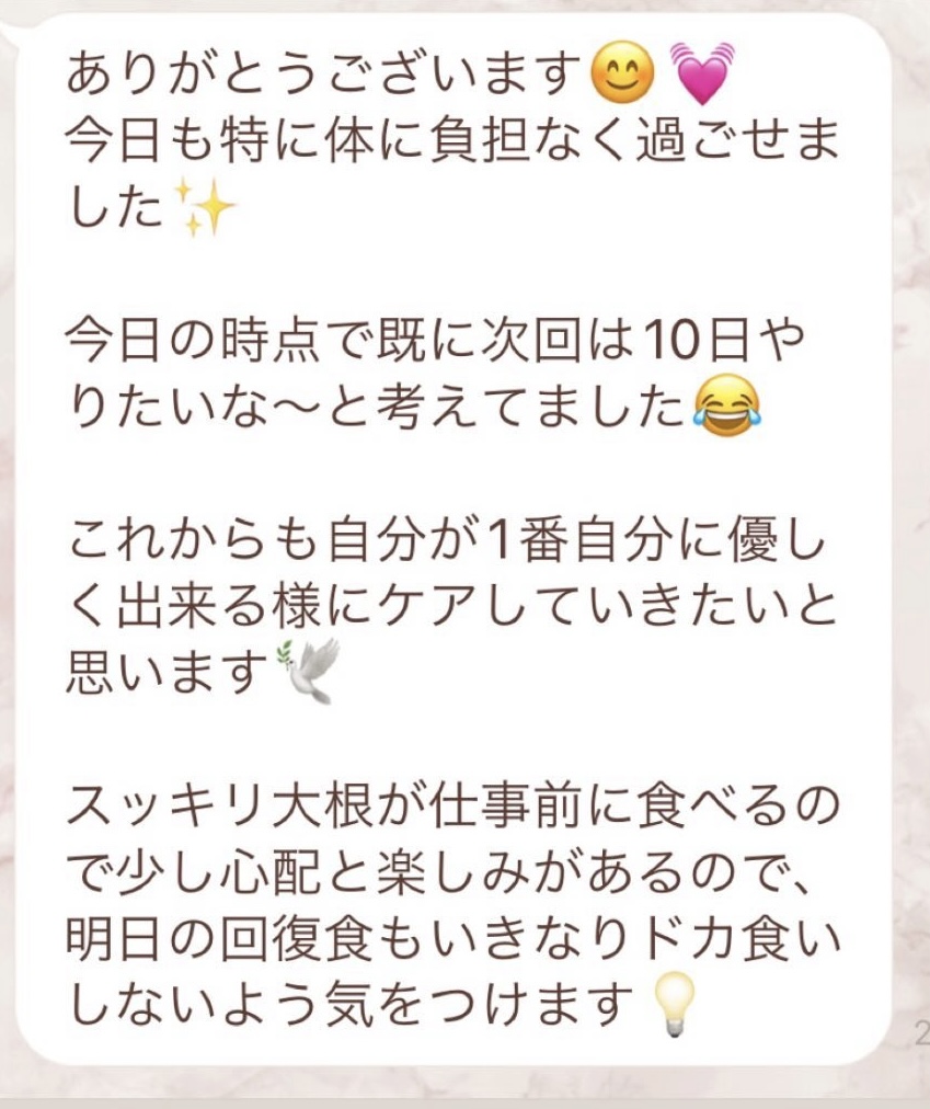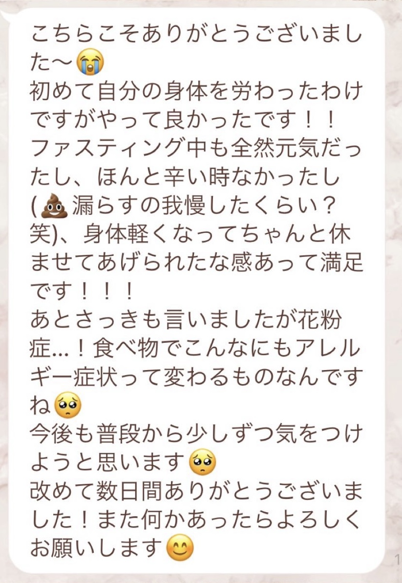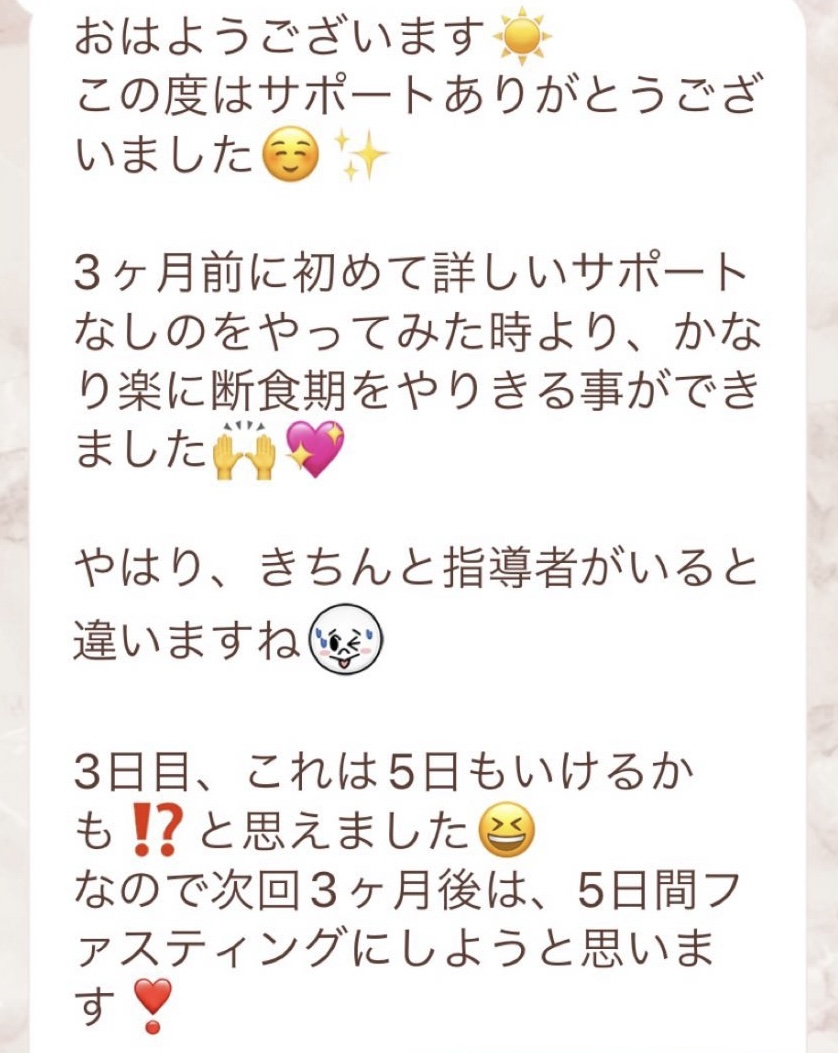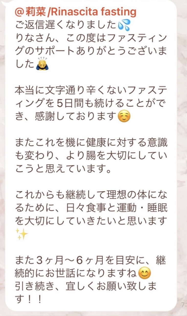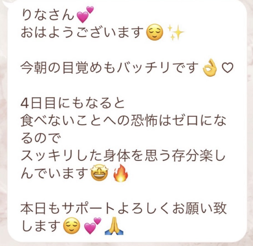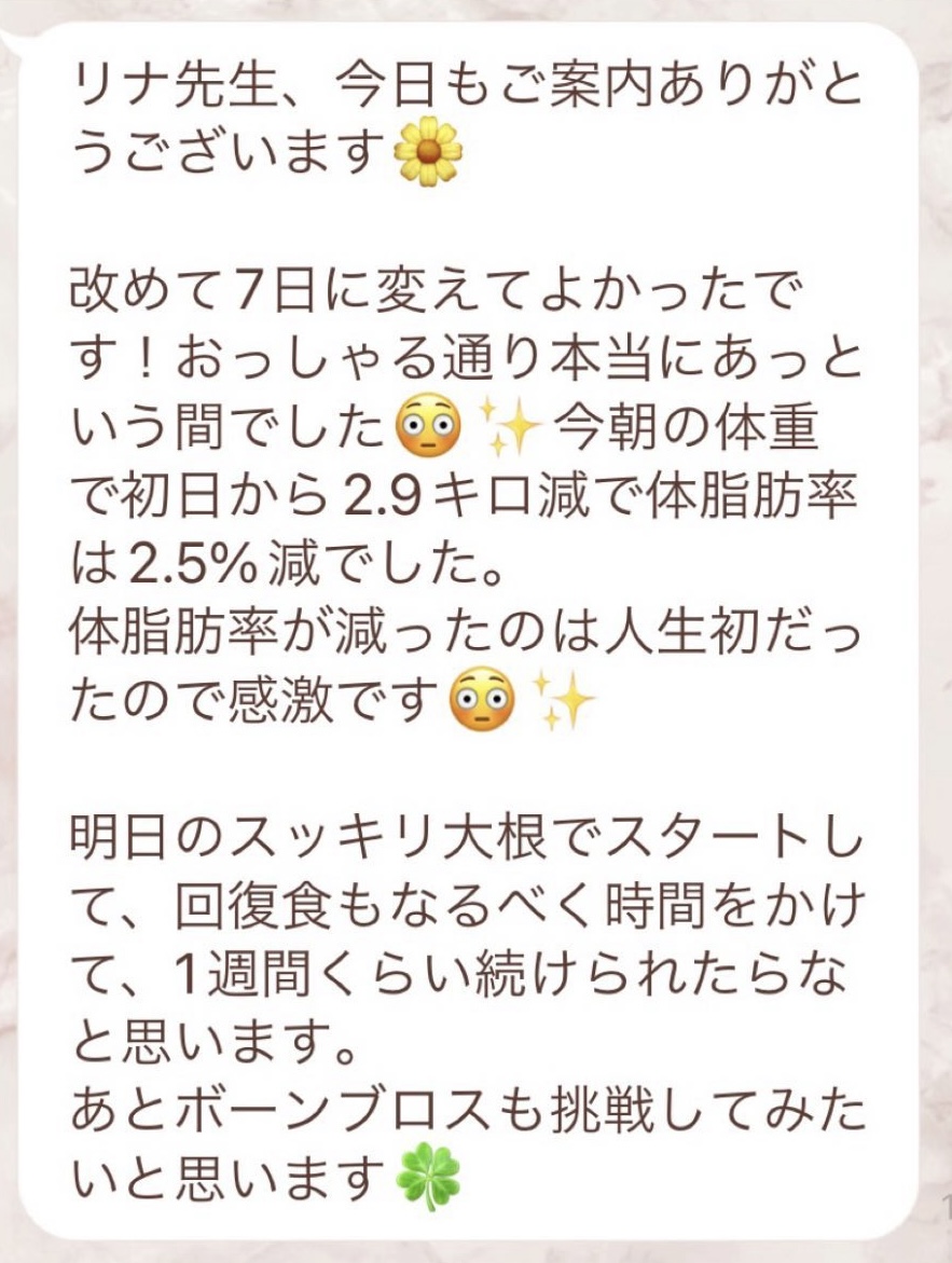 りなさんのサポートでは3回目のファスティングになります。今回は7日間でお願いしました✨りなさんから毎日届くLINEには知識やファスティングのコツなどがたっぷり詰まっていて、何度読んでも勉強になります!巷には情報が溢れていますが、信ぴょう性の低い情報も沢山あるのでりなさんから色々教えて貰えると安心できます😌ファスティングをやる度に、心身の状態がよくなって、体のことにも詳しくなれるなんて最高だと思います🥰✨✨とにかくサポートが手厚くて圧倒的安心感です。初めての方だけでなく久しぶりにやる方にもおすすめです!またよろしくお願いします🌸