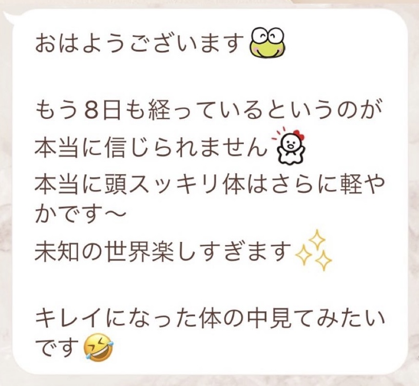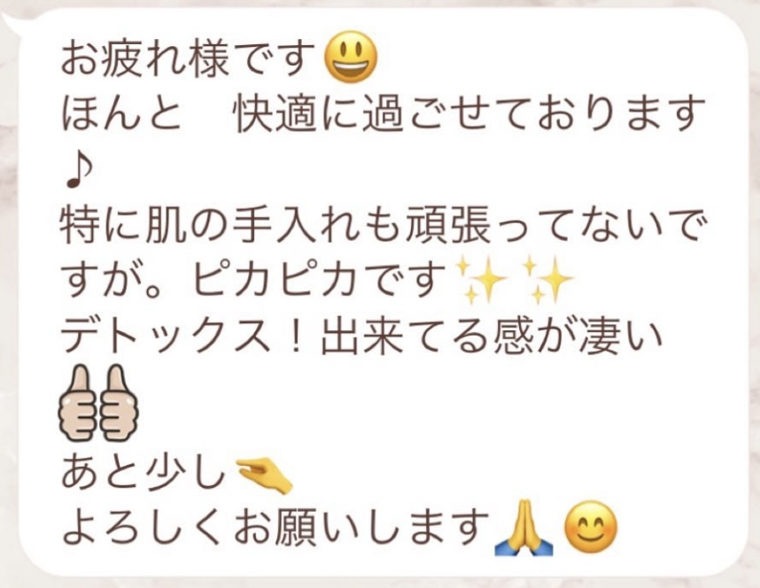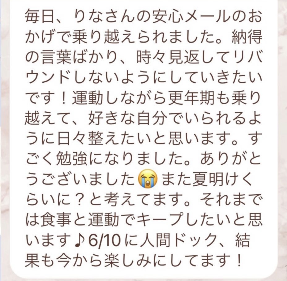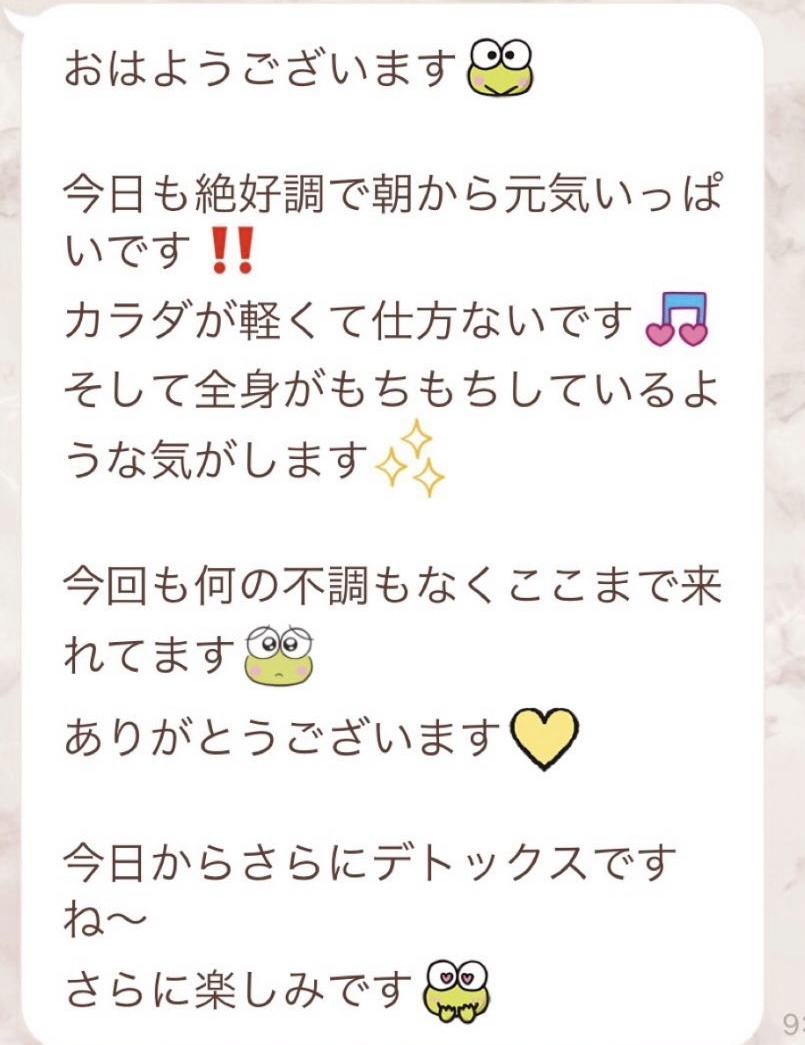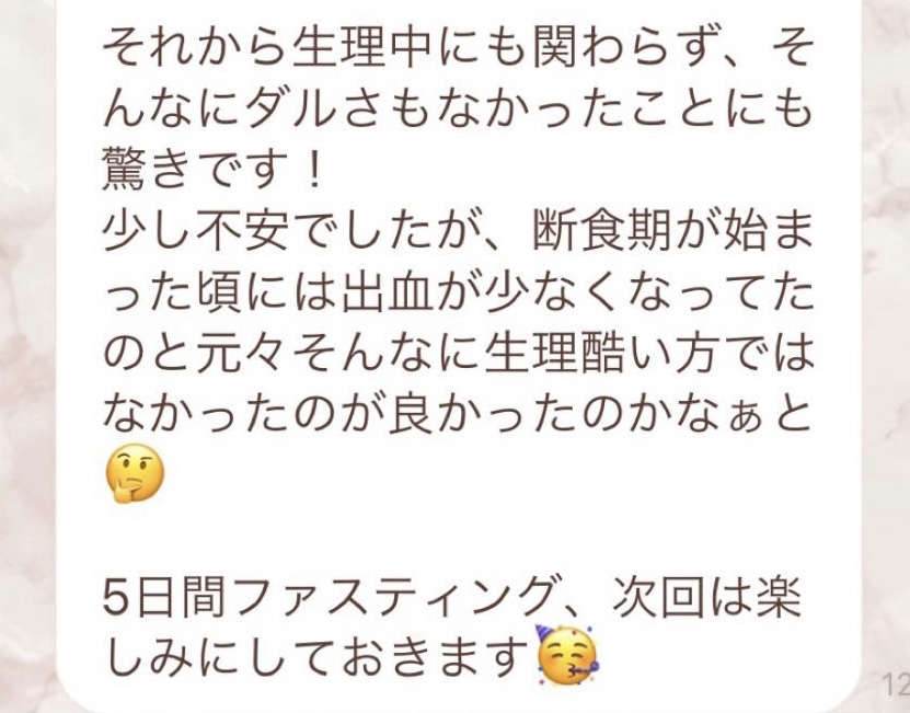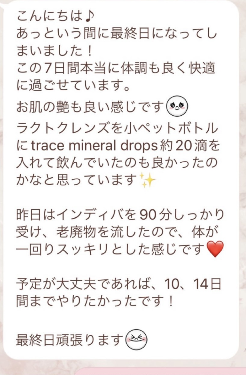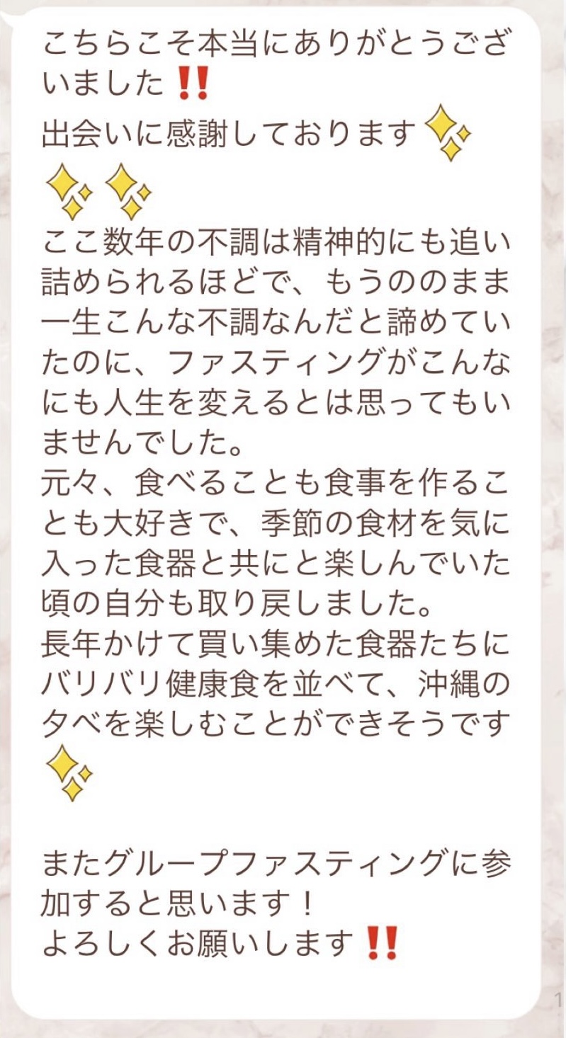 りなさんのサポートでは3回目のファスティングになります。今回は7日間でお願いしました✨りなさんから毎日届くLINEには知識やファスティングのコツなどがたっぷり詰まっていて、何度読んでも勉強になります!巷には情報が溢れていますが、信ぴょう性の低い情報も沢山あるのでりなさんから色々教えて貰えると安心できます😌ファスティングをやる度に、心身の状態がよくなって、体のことにも詳しくなれるなんて最高だと思います🥰✨✨とにかくサポートが手厚くて圧倒的安心感です。初めての方だけでなく久しぶりにやる方にもおすすめです!またよろしくお願いします🌸