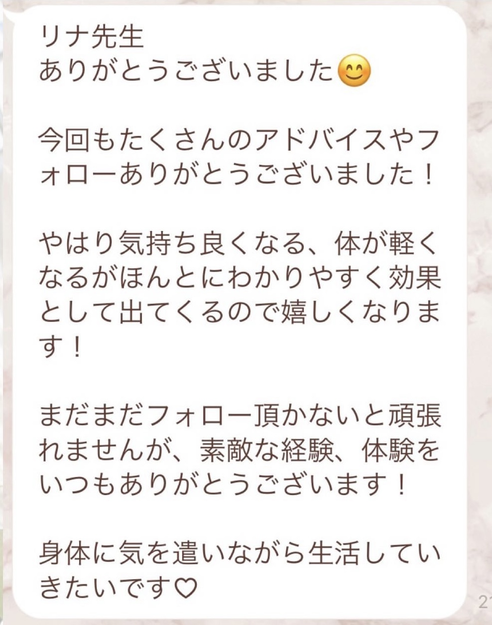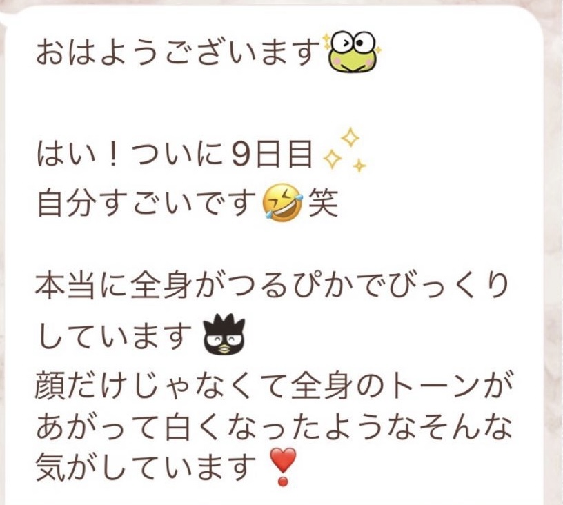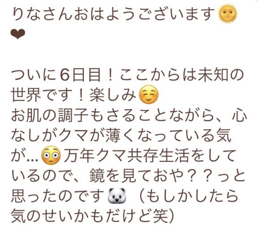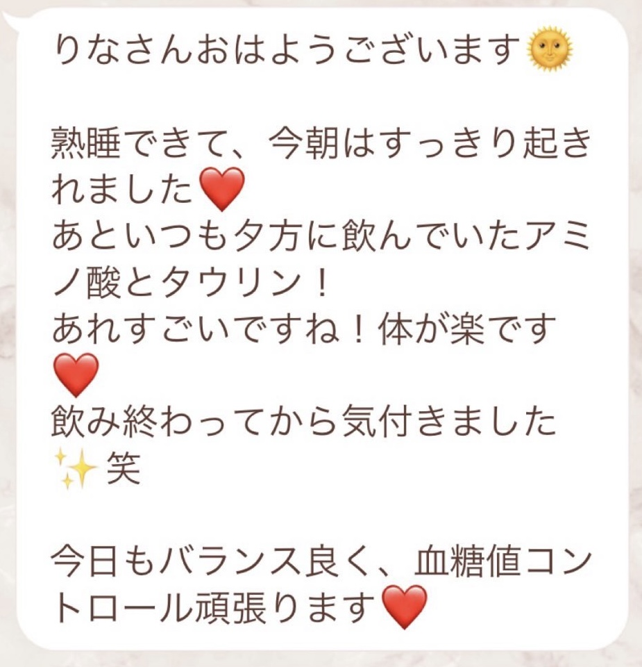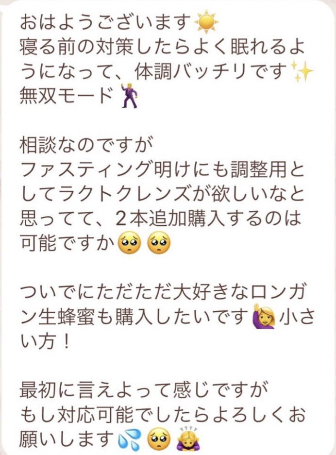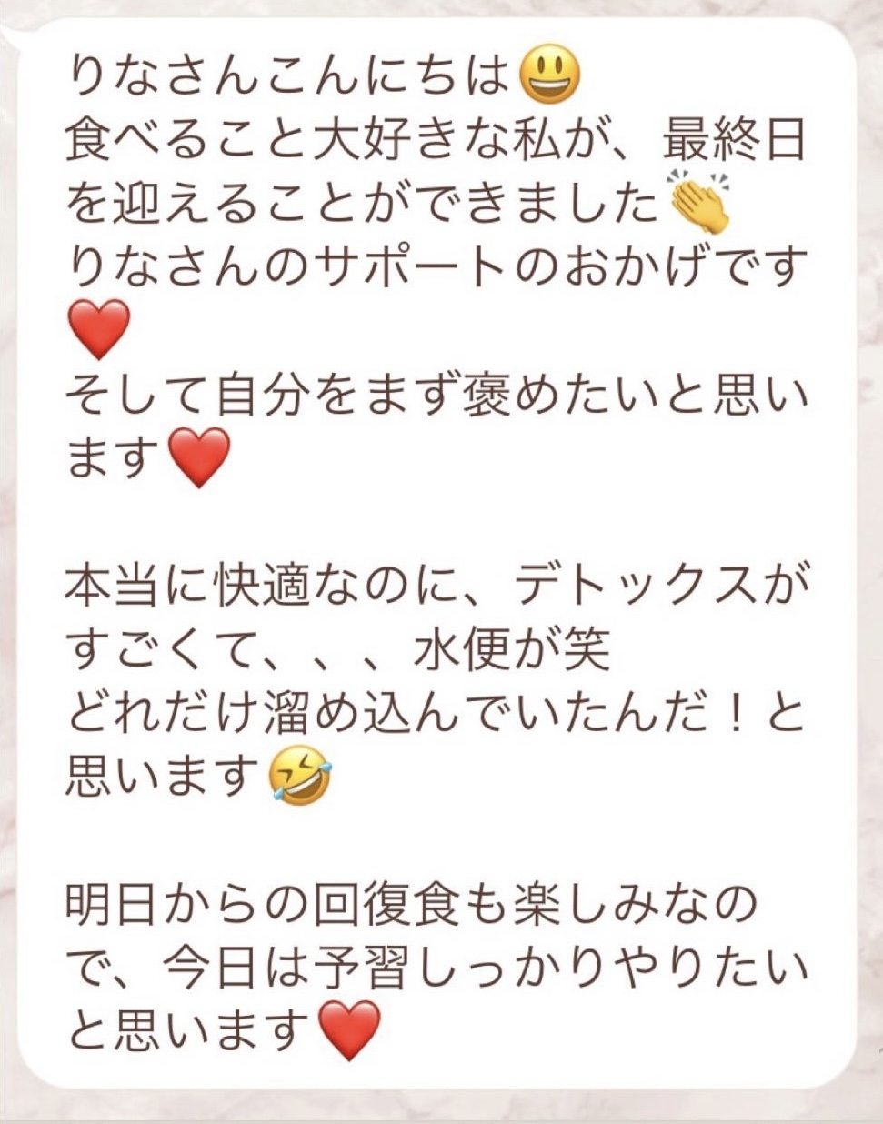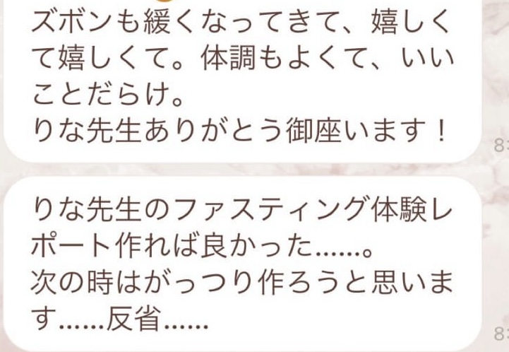りなさんのサポートでは3回目のファスティングになります。今回は7日間でお願いしました✨りなさんから毎日届くLINEには知識やファスティングのコツなどがたっぷり詰まっていて、何度読んでも勉強になります!巷には情報が溢れていますが、信ぴょう性の低い情報も沢山あるのでりなさんから色々教えて貰えると安心できます😌ファスティングをやる度に、心身の状態がよくなって、体のことにも詳しくなれるなんて最高だと思います🥰✨✨とにかくサポートが手厚くて圧倒的安心感です。初めての方だけでなく久しぶりにやる方にもおすすめです!またよろしくお願いします🌸