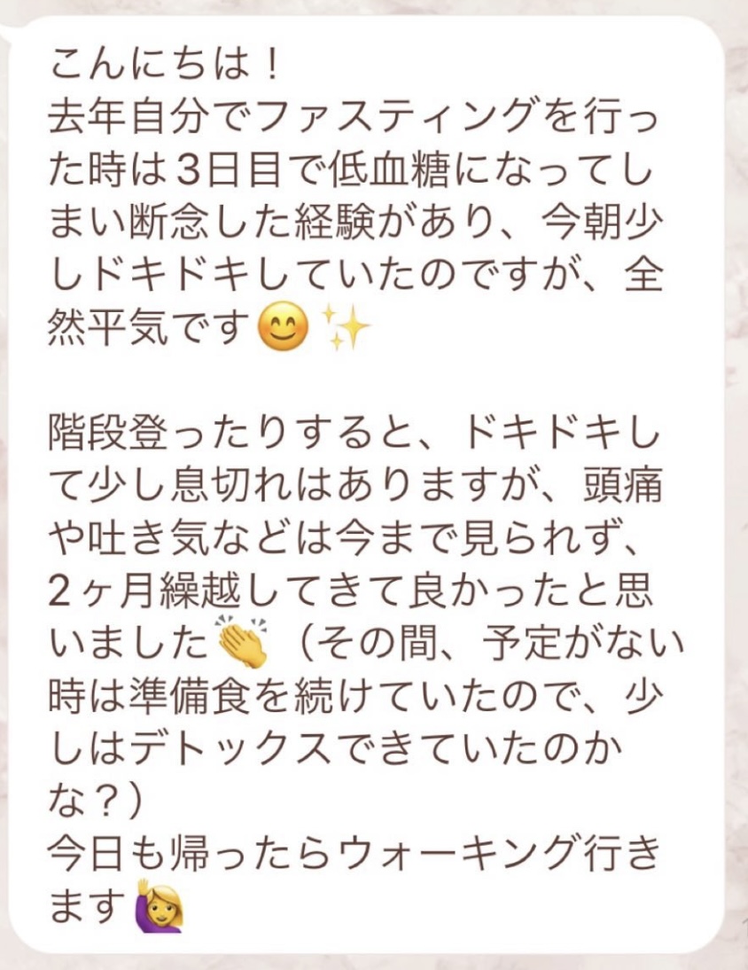 今回はじめて5日間のファスティングに挑戦しました!普段の生活習慣が乱れていたので、不調がでないかが不安でしたが事前相談では心配だったことを一つ一つ丁寧に説明してくださり、準備期間からファスティング期間、回復食まで安心して取り組むことができました✨改めて食の大切さを感じましたし、自分の身体をもっと大事に大事にしてあげようと気付くことができました!体重もマイナス3キロでかなりスッキリしたので、これを維持させるためにも引き続き食事や運動に意識しながら過ごしたいと思います😊心強いサポートを本当にありがとうございました!!