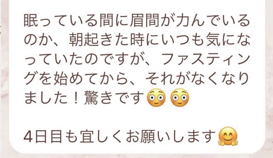 始める前は、ファスティングは空腹を耐えるというイメージでしたが、教えて頂いた通りに進めるとそんなことはなくストレスを感じずに5日間過ごすことが出来ました!ポジティブな言葉をかけて頂き、成功イメージを持てたのも引き寄せの法則的に、大きいと思います。また、今回理論を学べてファスティング後も食生活や運動の良い習慣を持てたことも大きな収穫でした。ありがとうございました!