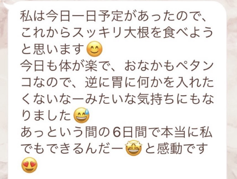 初めて5日間のファスティングに挑戦しました!失敗はしたくない、安心の講師の元でやりたいと思いRinascitafastingを選びました!結果は大成功で身体が中からスッキリしました!マイナス1.9kgの減量に成功して、お腹周り二の腕周りがほっそりしたように思います!ファスティング中もサポートのLINEが届くのでそのメッセージを読んでモチベーションUPする事ができたのでよかったです♡回復食のスッキリ大根では、身体の中の毒素が出てとってもスッキリすることが出来ました!ファスティング不安でしたが、空腹感もあまり出ずにやり遂げることが出来て満足しています!ありがとうございました(*^^*)