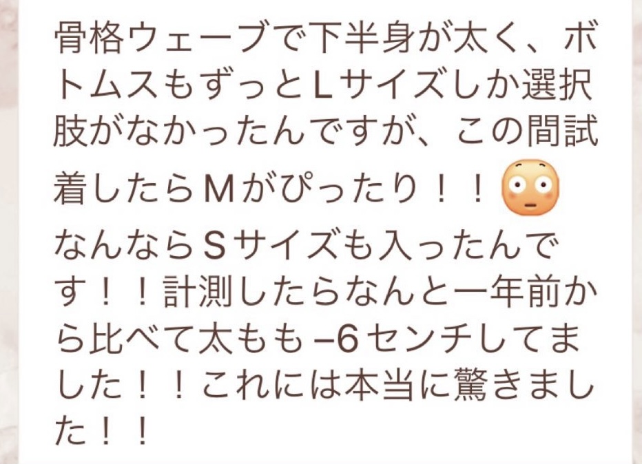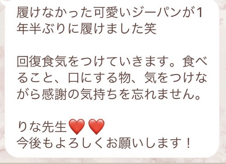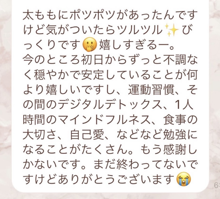 7日間ファスティングをさせて頂きました^^とても丁寧にサポートしてくださり、不安なく進めました✨心配していた空腹感もなく、めちゃくちゃ見た目が変化して周りから痩せたね!と言われます。りなさんがおっしゃる通りに全て身体の状態が当てはまっており、知識の深さがすごすぎました🥺毎日お通じもでて、お肌もツヤツヤ、洋服も太って履けなかったものが履けるように😭🙏ダイエット目的で今回しましたが、効果抜群でした!✨リバウンドに関してもその後のアドバイスも頂けたので、1年かけてファスティング取り入れつつ理想の身体を目指していきたいと思います^^リバウンドしてしまう人、特におすすめです!