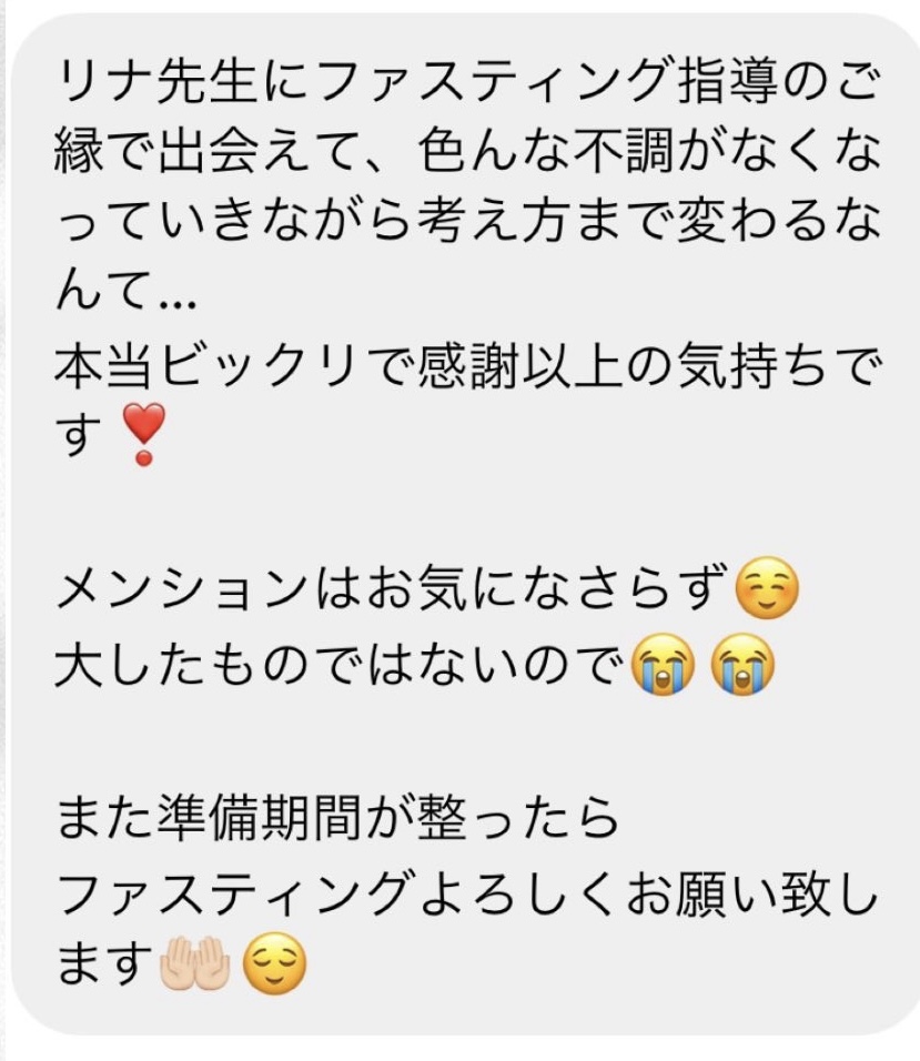 りなさんのインスタに出会い、知識はもちろん、りなさんの人柄に惚れ、りなさんからファスティングのサポートを受けたいと思い、すぐ申し込みました!何年か前にファスティングをした時は、低血糖気味になったりとにかく体がしんどくて、3日しかできなかったので、今回1週間やることに不安もあったんですが、実際やってみると、いつまででもできるなというくらい体が楽でとてもびっくりしました!ガイドブックとお客様専用ページを事前に送っていただき、それを見るとファスティング中どういうことが体で起こるのか、それがなぜ起こるのか、それに対してどうしたらいいかなど詳しく、そして分かりやすく書かれており、ファスティングの知識がない私でも理解でき、安心してファスティングを行うことができました。毎日りなさんから、その日体で起こることや、それに対してやった方がいいことなどのLINEを送ってくださるなど、本当にサポートがすごくて、声かけも心地よく、ファスティング期間本当に楽しかったです。私は肌荒れを改善したく、ファスティングを決断しました。ファスティング中少しニキビができ、不安になったんですが、すぐりなさんに相談すると、ニキビができる仕組みや、対処法、りなさんの体験談も教えてくださり、いつもだったら落ち込むところですが、それもなく過ごせました。悩みに寄り添っていただき、マインド面でもとても助けられました。ファスティングが終わり、ニキビができにくくなっていて、本当にやって良かったなと思っています!あと、私は低気圧頭痛になることがあり、ファスティング中は天候が悪い日も多かったんですが、全く頭痛が起こらず、体のだるさもなく、本当にびっくりしました!本当にりなさんに出会えたことに感謝しています♡サポートしていただきありがとうございました♡
