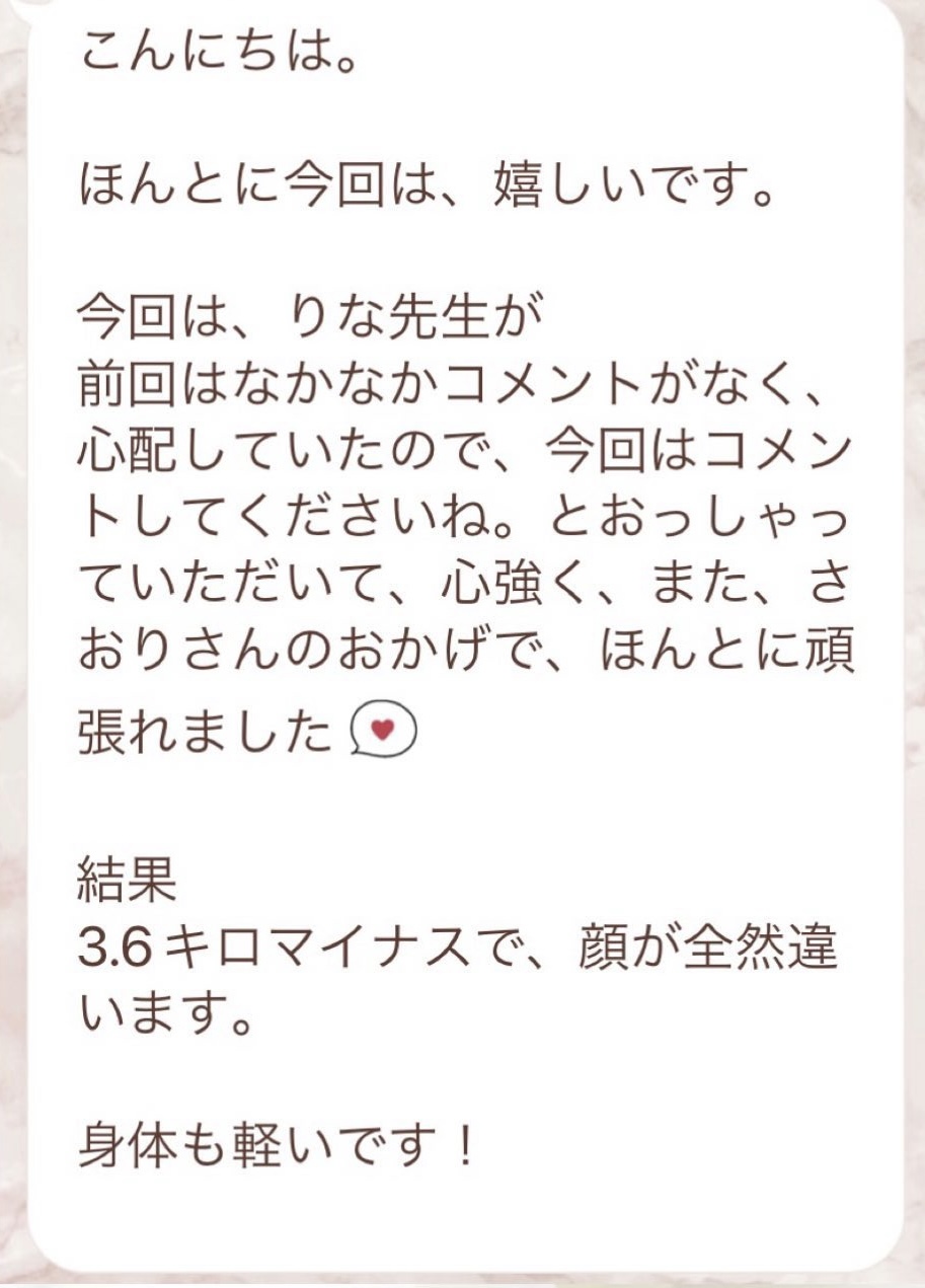 10日間のファスティングを受けました♡2023にも同じ10日間を経験していたので、不安などはなく挑めました✨リナ先生が準備期間・準備食期・ファスティング中・回復色期と日々温かいメッセージと共に正しい知識を教えてくださり、安心して毎日過ごすことができました☺️10日で4.8kg体重が落ち、ジムにも併せて通っていたのですが、その時のメニューの相談も乗ってくださり、より引き締めることができました☺️正しい知識のある先生のもと、安心して過ごせたおかげで、全く不調ゼロのまま4.8kg減らせられました!!感謝しかありません!!体に害のない、副作用もない、体の中から綺麗になれるファスティング♡私は本気でオススメですね✨月1で1〜3日のショートファスティングをしていこう!と思います🩷超絶美人なリナ先生!本当にありがとうございました♡